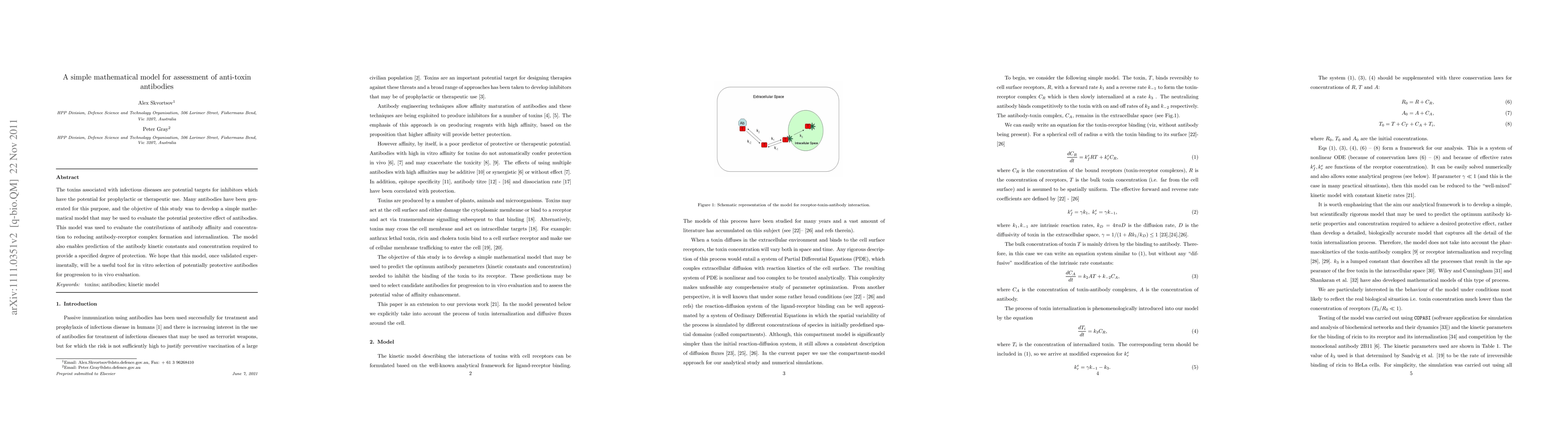 This study introduces a simple mathematical model to assess anti-toxin antibodies' effectiveness. It evaluates affinity and concentration contributions to reducing toxin-receptor interactions, predicting needed antibody kinetics and concentration for protection. The model aims to aid in selecting promising antibodies for further in vivo evaluation.