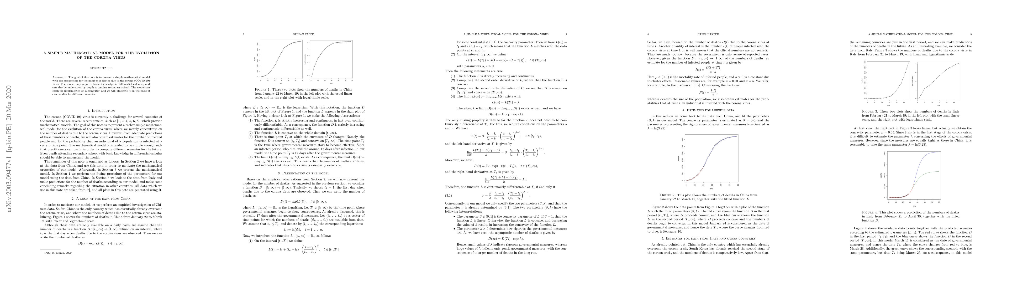The goal of this note is to present a simple mathematical model with two parameters for the number of deaths due to the corona (COVID-19) virus. The model only requires basic knowledge in differential calculus, and can also be understood by pupils attending secondary school. The model can easily be implemented on a computer, and we will illustrate it on the basis of case studies for different countries.