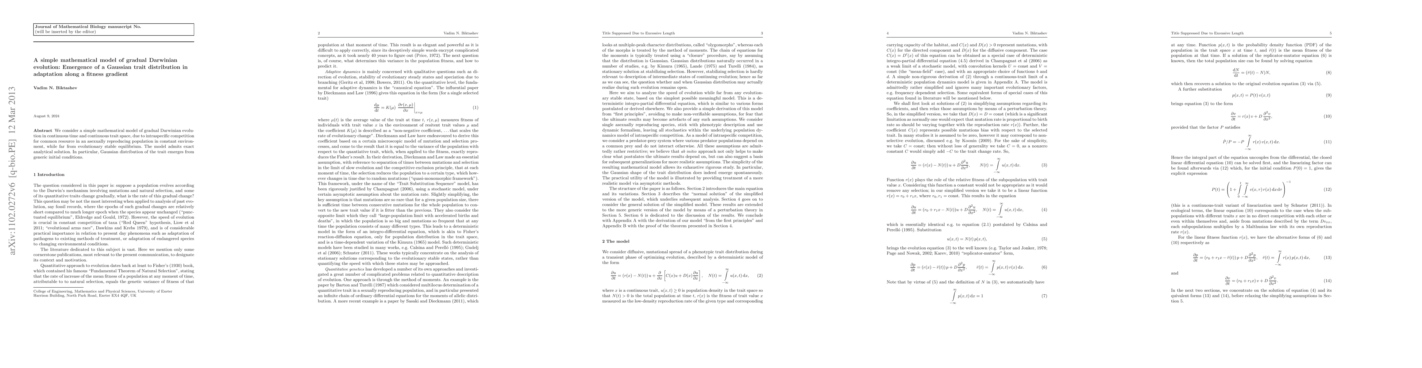 This paper presents a mathematical model of gradual Darwinian evolution that predicts the emergence of a Gaussian trait distribution due to intraspecific competition in a constant environment. The model provides an exact analytical solution showing how the trait distribution evolves over time.