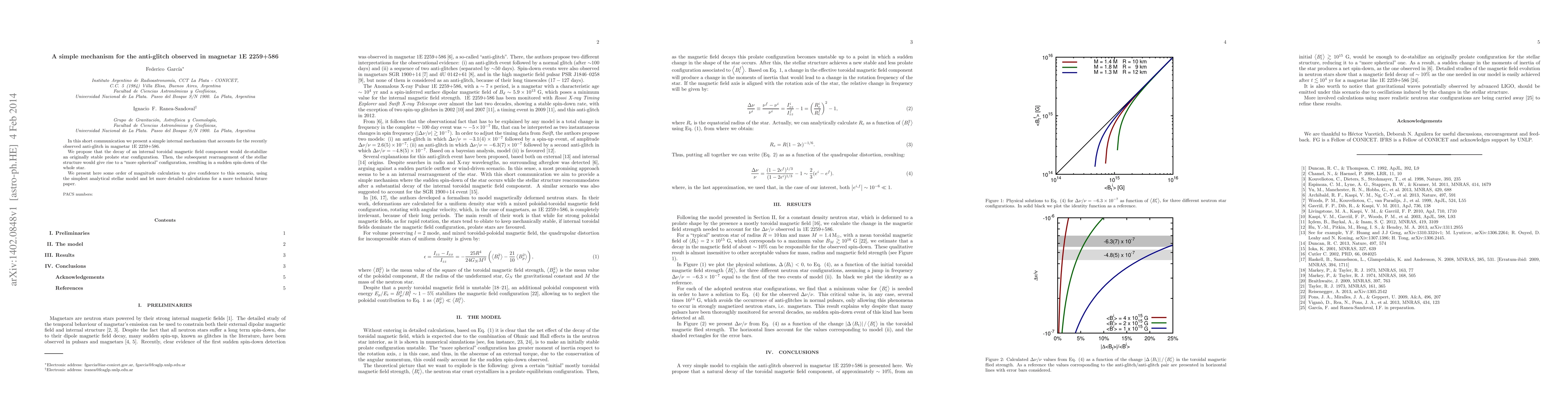 The paper proposes a simple mechanism for the anti-glitch in magnetar 1E 2259+586, suggesting that the decay of an internal toroidal magnetic field component destabilizes a prolate star configuration, leading to a more spherical shape and a sudden spin-down. The authors provide preliminary calculations supporting this scenario for further detailed examination in future research.