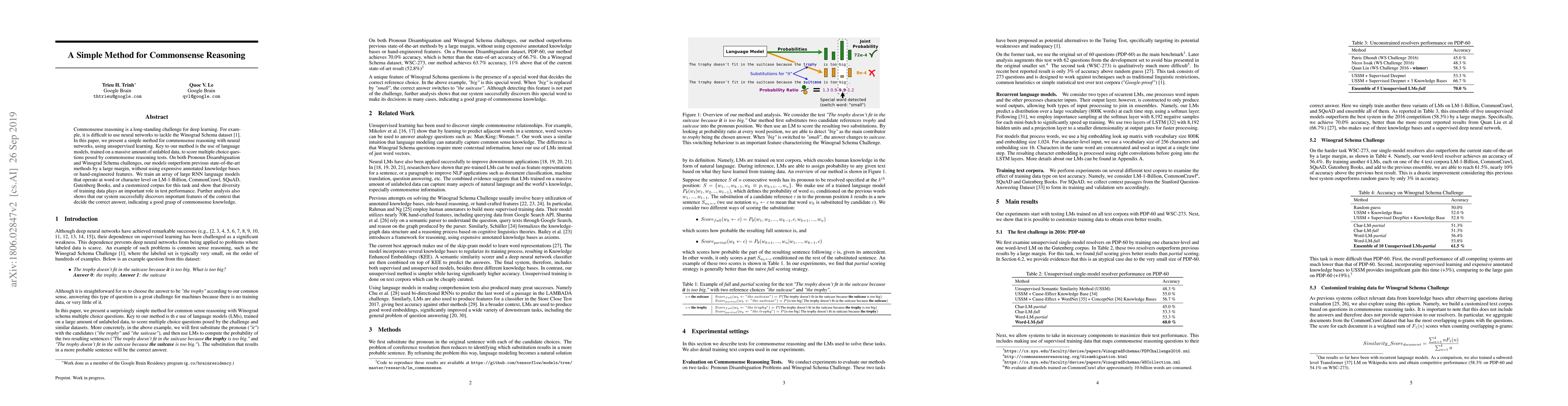 This paper introduces a simple yet effective neural network method for commonsense reasoning using unsupervised learning and large language models trained on diverse datasets. The proposed approach outperforms previous methods on Pronoun Disambiguation and Winograd Schema challenges, demonstrating the importance of varied training data in achieving strong commonsense understanding.