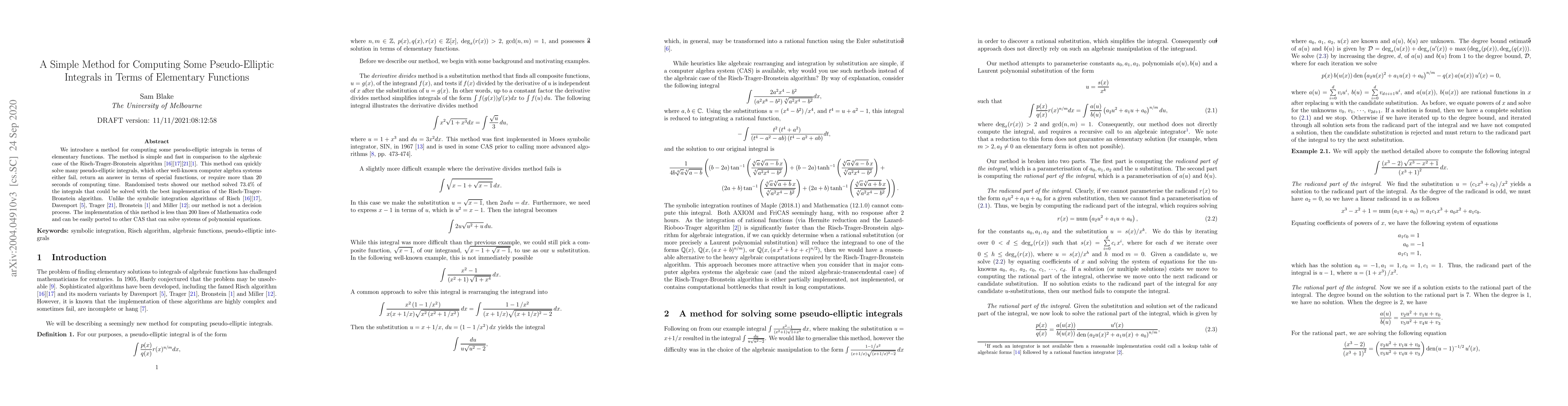 Researchers developed a simple method to solve pseudo-elliptic integrals using elementary functions, outperforming existing algorithms in speed and accuracy.