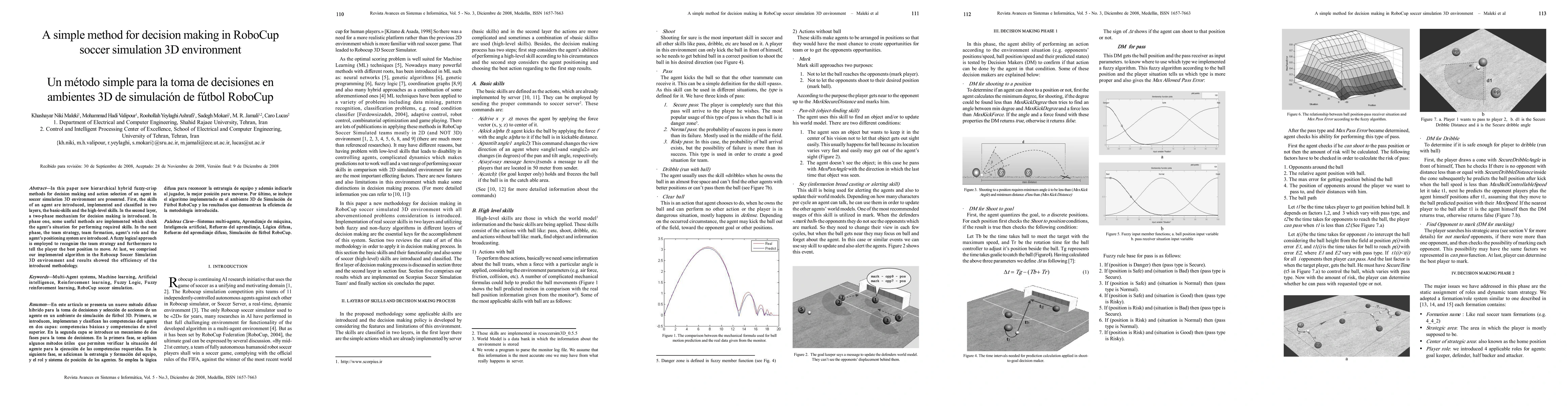 In this paper new hierarchical hybrid fuzzy-crisp methods for decision making and action selection of an agent in soccer simulation 3D environment are presented. First, the skills of an agent are introduced, implemented and classified in two layers, the basicskills and the highlevel skills. In the second layer, a twophase mechanism for decision making is introduced. In phase one, some useful methods are implemented which check the agent's situation for performing required skills. In the next phase, the team str ategy, team for mation, agent's role and the agent's positioning system are introduced. A fuzzy logical approach is employed to recognize the team strategy and further more to tell the player the best position to move. At last, we comprised our implemented algor ithm in the Robocup Soccer Simulation 3D environment and results showed th eefficiency of the introduced methodology.