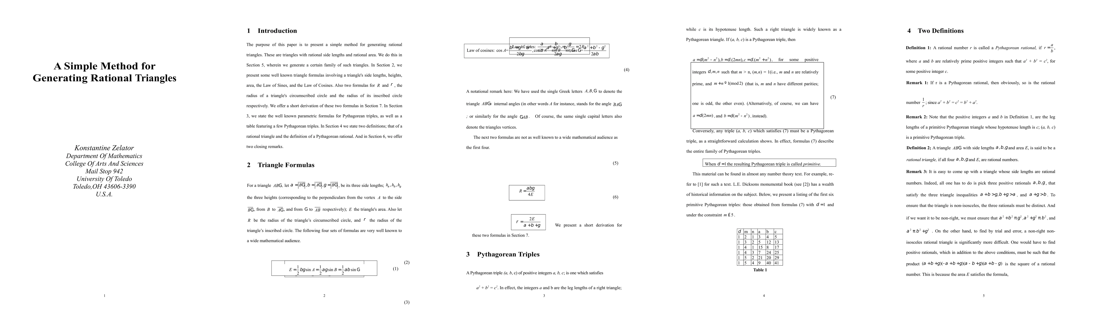 In the early part of the paper, various geometrical formulas are derived. Then, at some point in the paper, the concept of a Pythagorean rational is introduced. A Pythagorean rational is a rational number which is the ratio of two integers which are the leglengths of a Pythagorean triangle. Using the idea of Pythagorean rationals, we generate two families of rational triangles. We define a rational triangle to be a triangle with rational sidelengths and area.