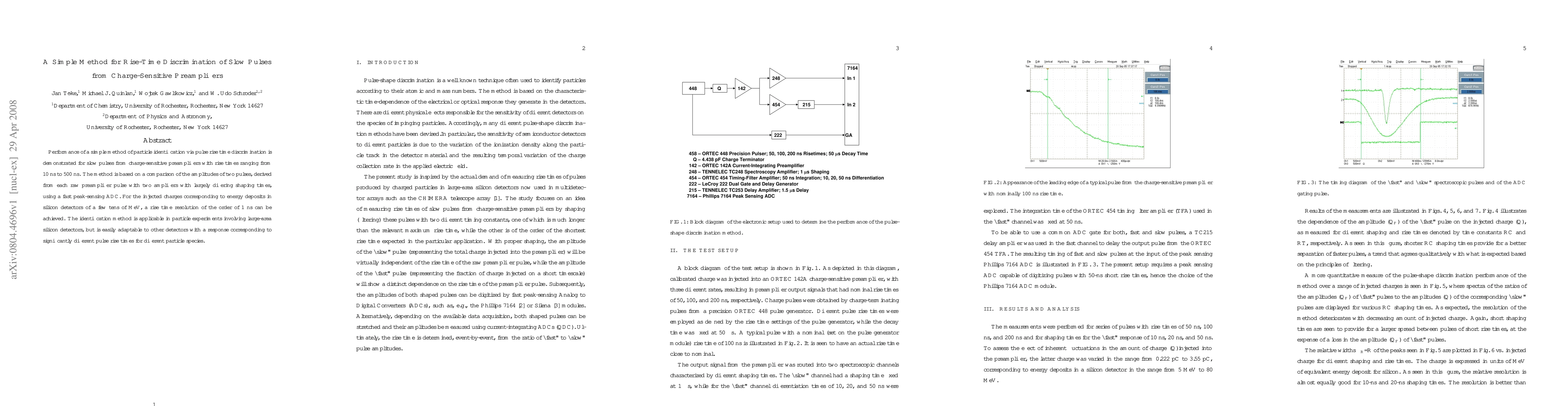 The paper introduces a novel approach for rise-time discrimination of slow pulses from charge-sensitive preamplifiers using amplitude comparisons of pulses shaped with differing time constants and measured by a fast peak-sensing ADC.