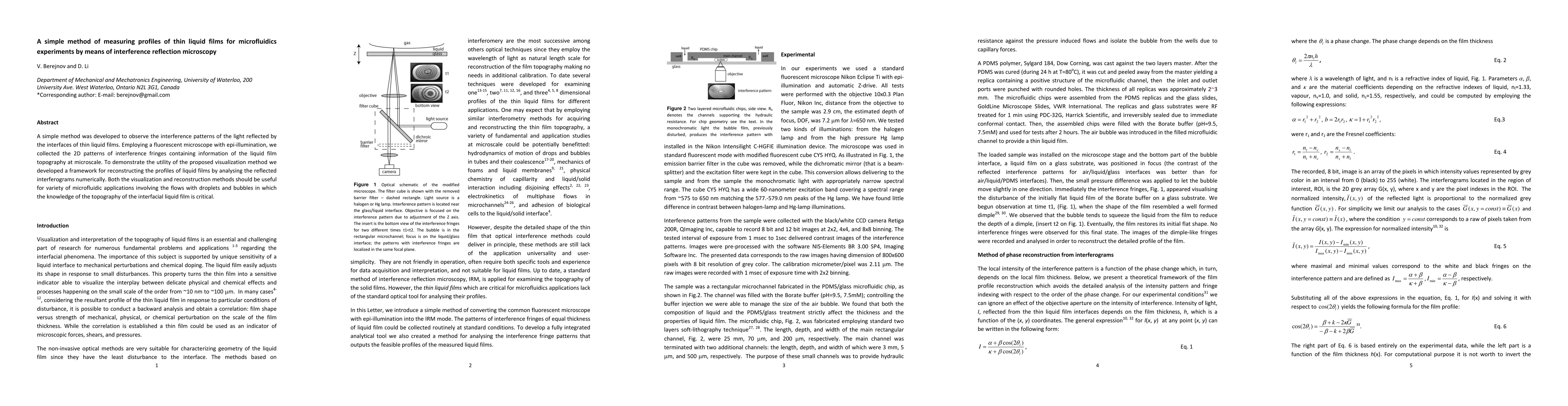 A simple method was developed to observe the interference patterns of the light reflected by the interfaces of thin liquid films. Employing a fluorescent microscope with epi-illumination, we collected the 2D patterns of interference fringes containing information of the liquid film topography at microscale. To demonstrate the utility of the proposed visualization method we developed a framework for reconstructing the profiles of liquid films by analysing the reflected interferograms numerically. Both the visualization and reconstruction methods should be useful for variety of microfluidic applications involving the flows with droplets and bubbles in which the knowledge of the topography of the interfacial liquid film is critical.