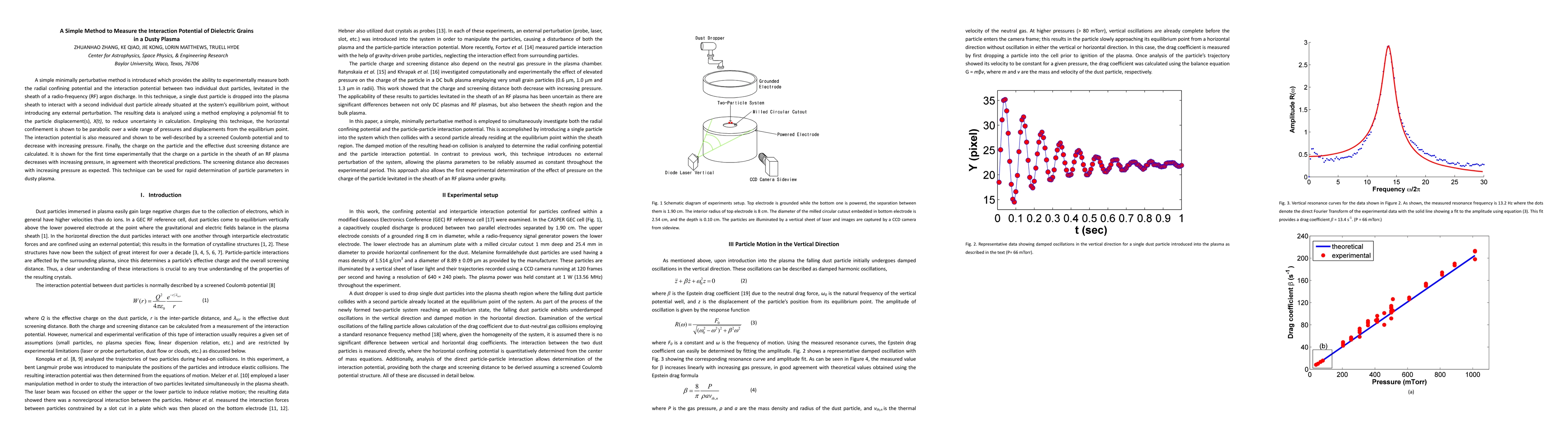 A simple minimally perturbative method is introduced which provides the ability to experimentally measure both the radial confining potential and the interaction potential between two individual dust particles, levitated in the sheath of a radio-frequency (RF) argon discharge. In this technique, a single dust particle is dropped into the plasma sheath to interact with a second individual dust particle already situated at the system's equilibrium point, without introducing any external perturbation. The resulting data is analyzed using a method employing a polynomial fit to the particle displacement(s), X(t), to reduce uncertainty in calculation. Employing this technique, the horizontal confinement is shown to be parabolic over a wide range of pressures and displacements from the equilibrium point. The interaction potential is also measured and shown to be well-described by a screened Coulomb potential and to decrease with increasing pressure. Finally, the charge on the particle and the effective dust screening distance are calculated. It is shown for the first time experimentally that the charge on a particle in the sheath of an RF plasma decreases with increasing pressure, in agreement with theoretical predictions. The screening distance also decreases with increasing pressure as expected. This technique can be used for rapid determination of particle parameters in dusty plasma.