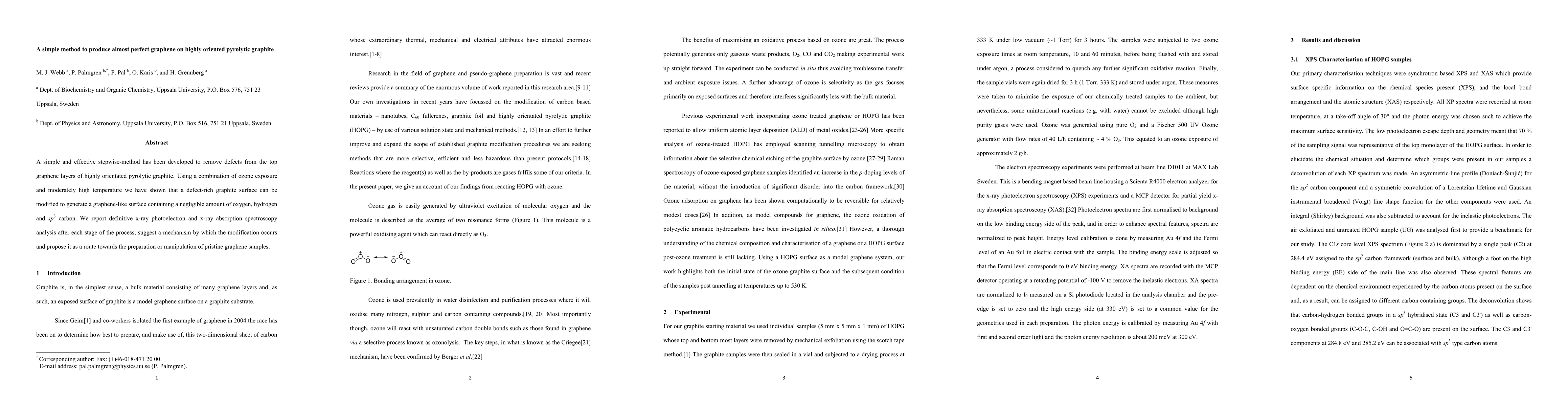 This paper presents a straightforward method to produce high-quality graphene on highly oriented pyrolytic graphite by combining ozone exposure and moderate heating, resulting in minimal oxygen, hydrogen, and sp3 carbon contamination. The process is analyzed using x-ray photoelectron and x-ray absorption spectroscopy to validate the defect removal.