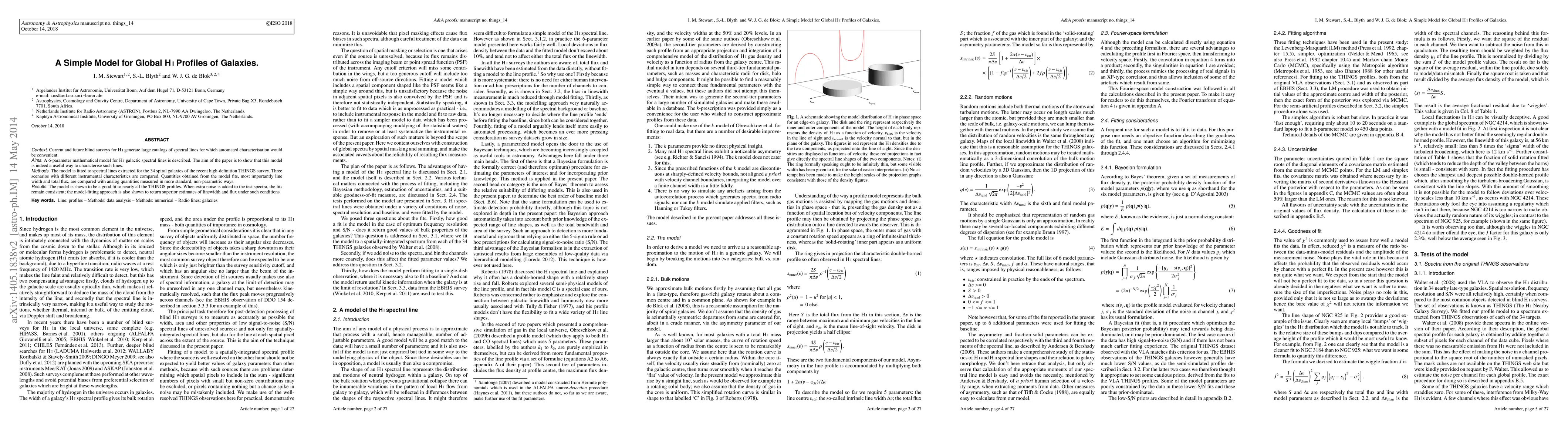 Context. Current and future blind surveys for HI generate large catalogs of spectral lines for which automated characterization would be convenient. Aims. A 6-parameter mathematical model for HI galactic spectral lines is described. The aim of the paper is to show that this model is indeed a useful way to characterize such lines. Methods. The model is fitted to spectral lines extracted for the 34 spiral galaxies of the recent high-definition THINGS survey. Three scenarios with different instrumental characteristics are compared. Quantities obtained from the model fits, most importantly line width and total flux, are compared with analog quantities measured in more standard, non-parametric ways. Results. The model is shown to be a good fit to nearly all the THINGS profiles. When extra noise is added to the test spectra, the fits remain consistent; the model-fitting approach is also shown to return superior estimates of linewidth and flux under such conditions.
