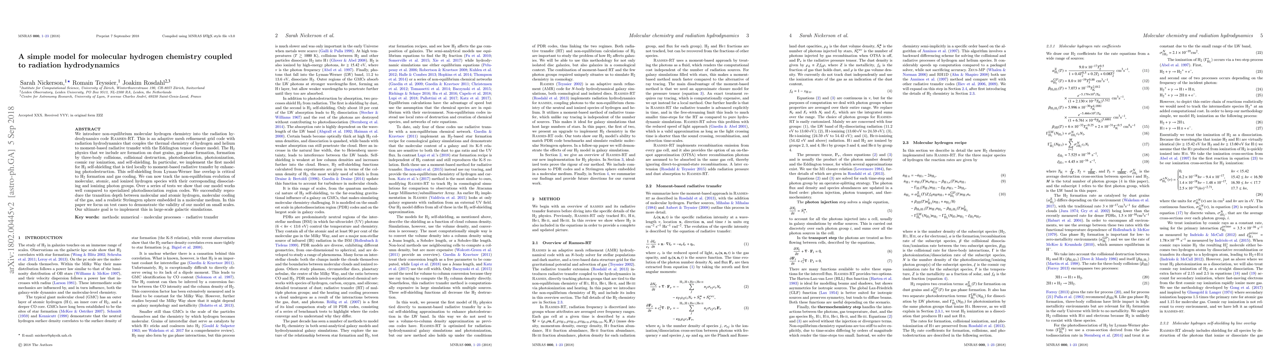 We introduce non-equilibrium molecular hydrogen chemistry into the radiation hydrodynamics code Ramses-RT. This is an adaptive mesh refinement grid code with radiation hydrodynamics that couples the thermal chemistry of hydrogen and helium to moment-based radiative transfer with the Eddington tensor closure model. The H2 physics that we include are formation on dust grains, gas phase formation, formation by three-body collisions, collisional destruction, photodissociation, photoionization, cosmic ray ionization, and self-shielding. In particular, we implement the first model for H2 self-shielding that is tied locally to moment-based radiative transfer by enhancing photodestruction. This self-shielding from Lyman-Werner line overlap is critical to H2 formation and gas cooling. We can now track the non-equilibrium evolution of molecular, atomic, and ionized hydrogen species with their corresponding dissociating and ionizing photon groups. Over a series of tests we show that our model works well compared to specialized photodissociation region codes. We successfully reproduce the transition depth between molecular and atomic hydrogen, molecular cooling of the gas, and a realistic Stromgren sphere embedded in a molecular medium. In this paper we focus on test cases to demonstrate the validity of our model on small scales. Our ultimate goal is to implement this in large-scale galactic simulations.