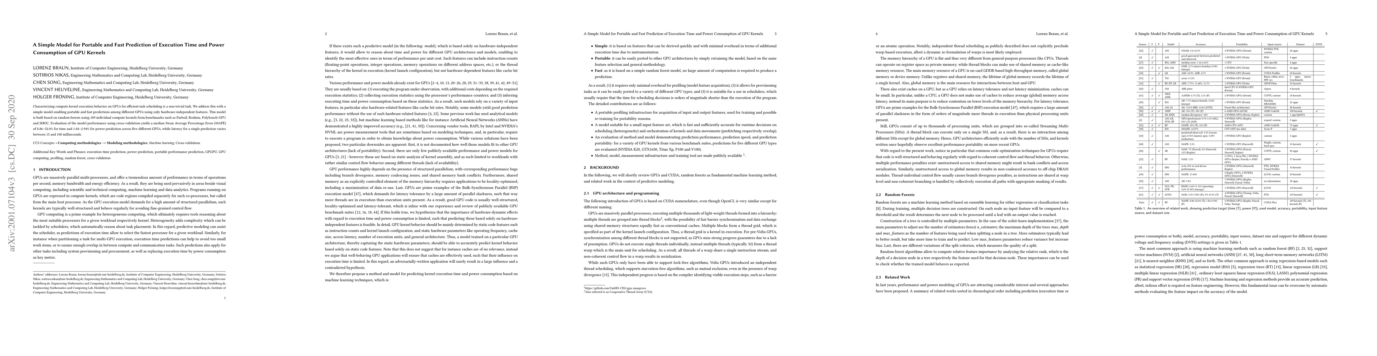Researchers developed a simple model for predicting GPU kernel execution time and power consumption using hardware-independent features, with median prediction errors of 8.86-52.00% and 1.84-2.94%. The model achieved fast and portable predictions across different GPUs.