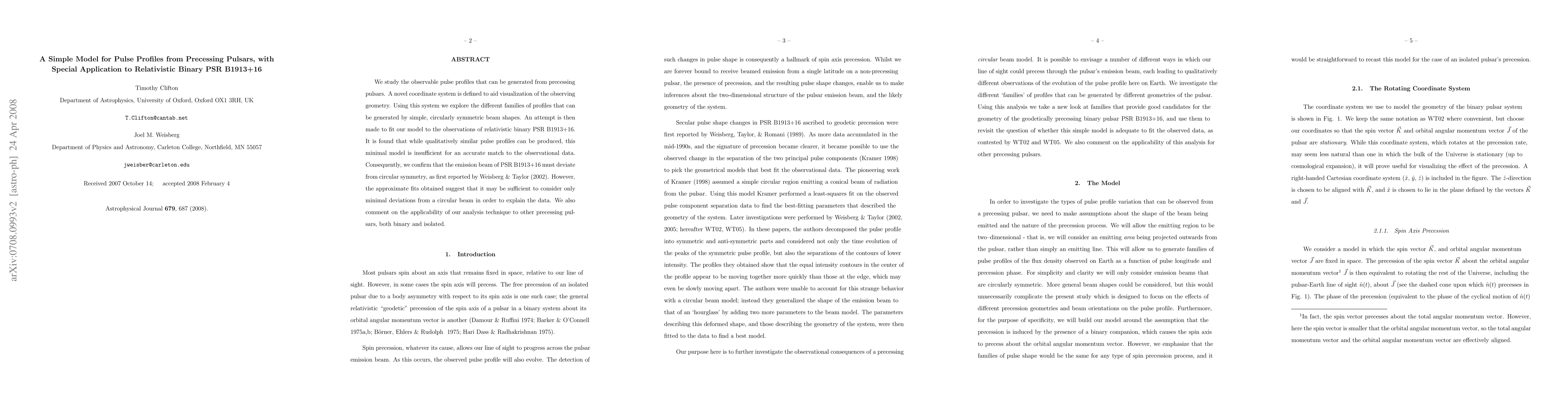 The paper proposes a model for pulse profiles from precessing pulsars, introducing a new coordinate system. Applying it to PSR B1913+16, the model qualitatively matches observations but fails to accurately fit, confirming the pulsar's beam isn't circularly symmetric. Minor deviations from a circular beam may suffice to explain the data, with potential applicability to other precessing pulsars.