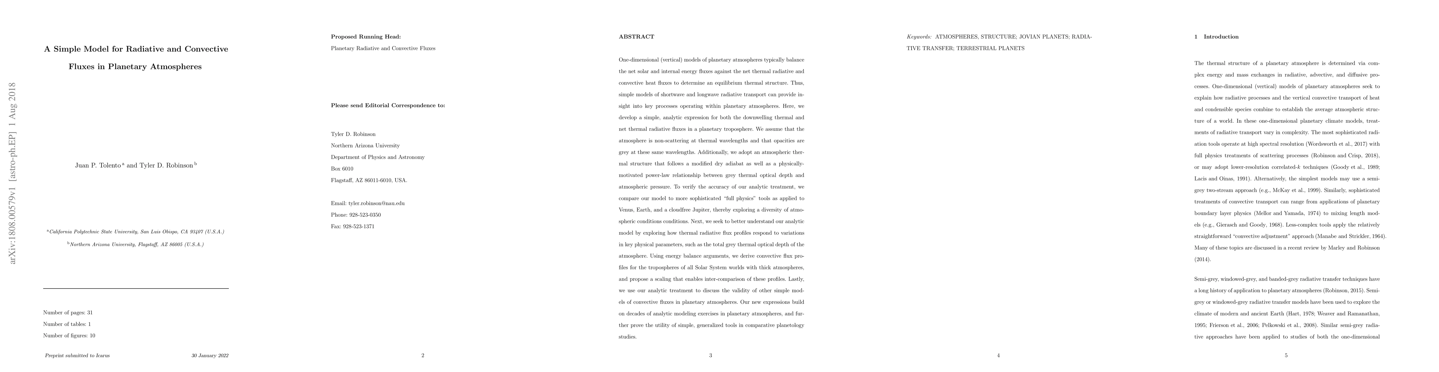 This paper develops a simple, analytic model for radiative and convective fluxes in planetary atmospheres, focusing on downwelling thermal and net thermal radiative fluxes. The model is validated against sophisticated tools for Venus, Earth, and cloud-free Jupiter, and it explores the impact of varying key parameters on thermal radiative flux profiles.