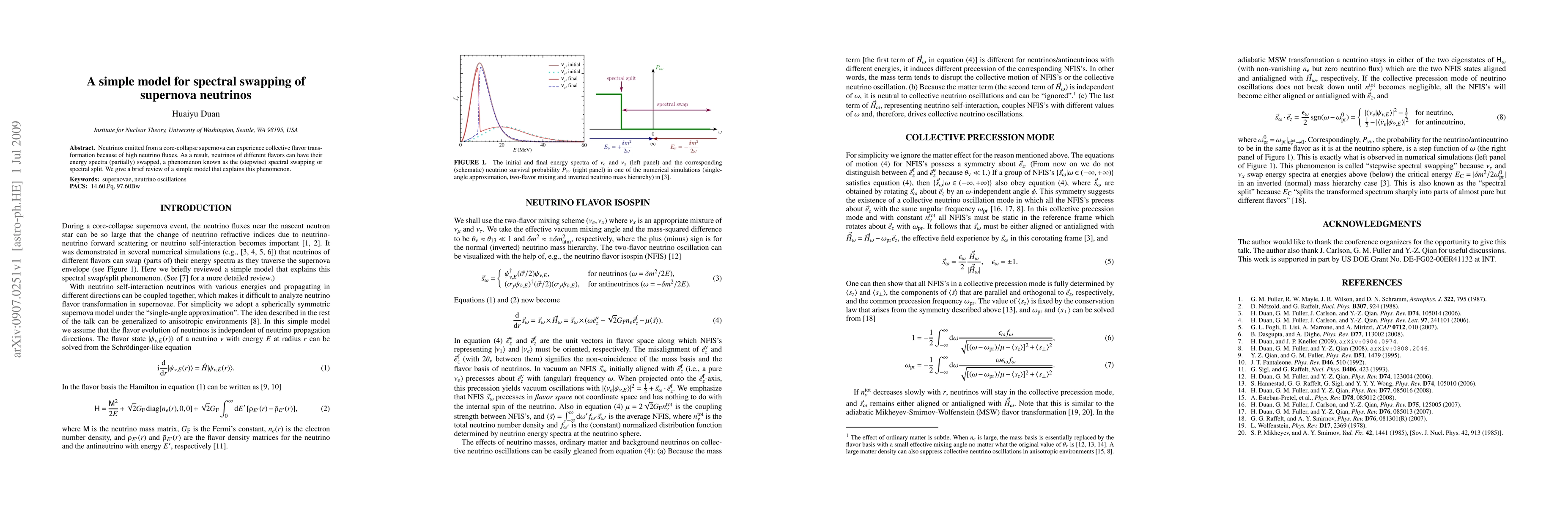 This paper reviews a simple model explaining the spectral swapping of supernova neutrinos, where high fluxes lead to collective flavor transformation and swapping of energy spectra among different neutrino flavors. The phenomenon is termed stepwise spectral swapping or spectral split.