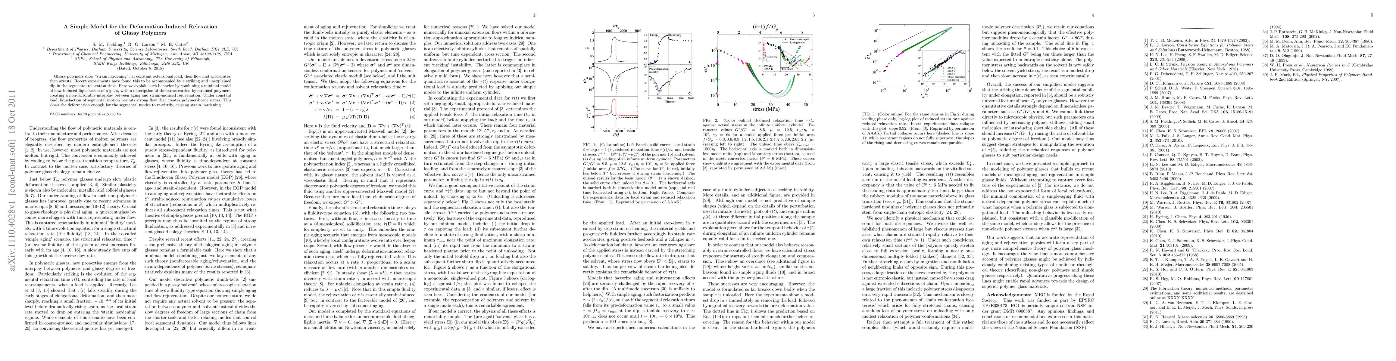 This paper proposes a simple model to explain the deformation-induced relaxation in glassy polymers, showing how flow-induced liquefaction and polymer-borne stress interplay to cause strain hardening and a dip in segmental relaxation time under constant load. The model combines flow-induced liquefaction with stress-induced rejuvenation, illustrating the complex relationship between aging and strain-induced rejuvenation.