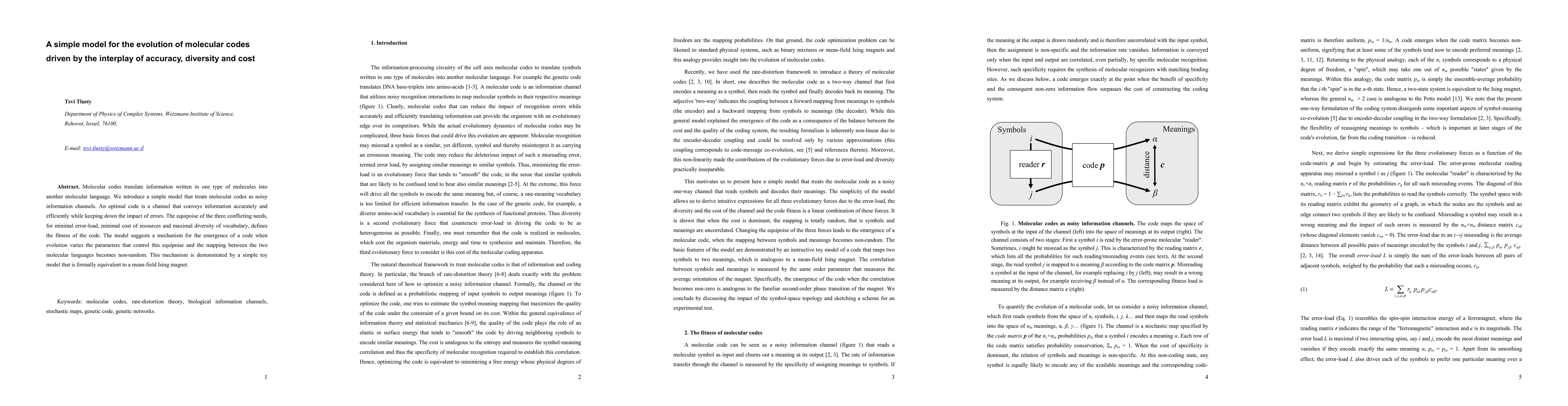 Molecular codes translate information written in one type of molecules into another molecular language. We introduce a simple model that treats molecular codes as noisy information channels. An optimal code is a channel that conveys information accurately and efficiently while keeping down the impact of errors. The equipoise of the three conflicting needs, for minimal error-load, minimal cost of resources and maximal diversity of vocabulary, defines the fitness of the code. The model suggests a mechanism for the emergence of a code when evolution varies the parameters that control this equipoise and the mapping between the two molecular languages becomes non-random. This mechanism is demonstrated by a simple toy model that is formally equivalent to a mean-field Ising magnet.