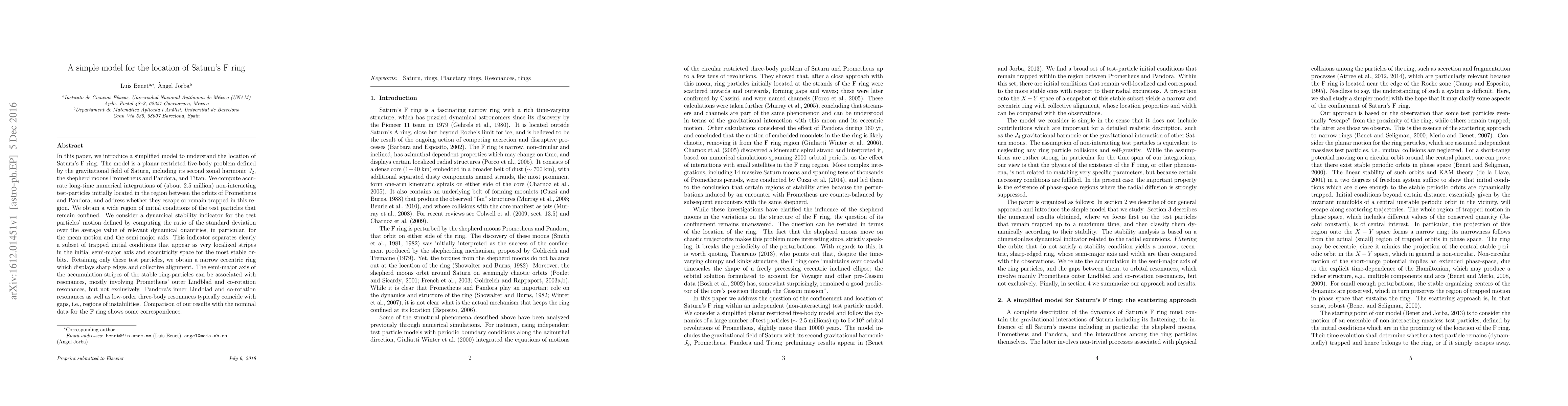 This paper presents a simplified model to explain Saturn's F ring's location using a planar restricted five-body problem, revealing stable regions for test particles trapped between Prometheus and Pandora, associated with specific resonances, and showing some correspondence with actual F ring data.