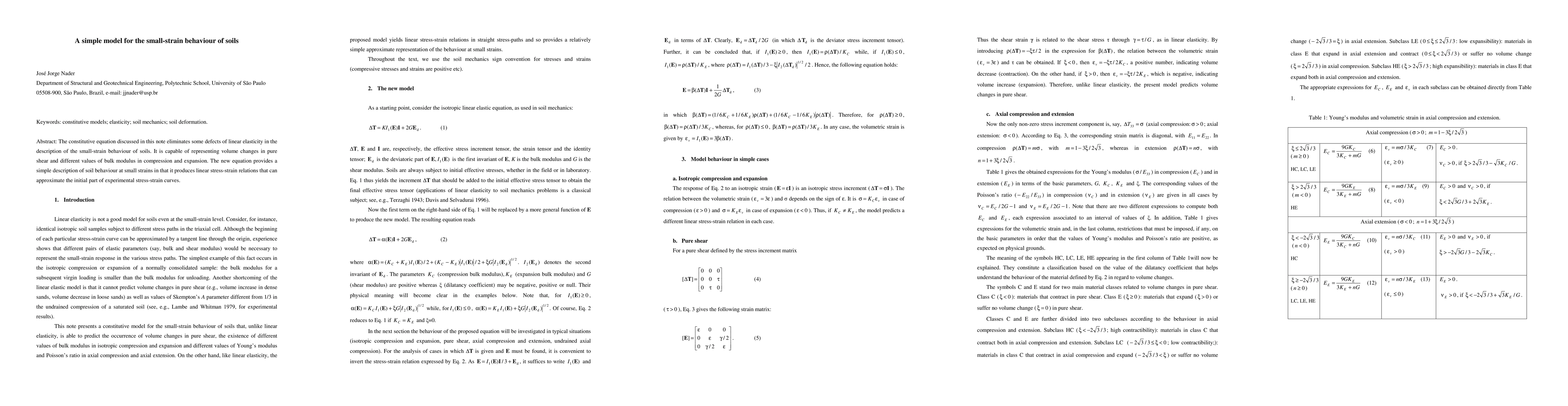 The constitutive equation discussed in this note eliminates some defects of linear elasticity in the description of the small-strain behaviour of soils. It is capable of representing volume changes in pure shear and different values of bulk modulus in compression and expansion. The new equation provides a simple description of soil behaviour at small strains in that it produces linear stress-strain relations that can approximate the initial part of experimental stress-strain curves.