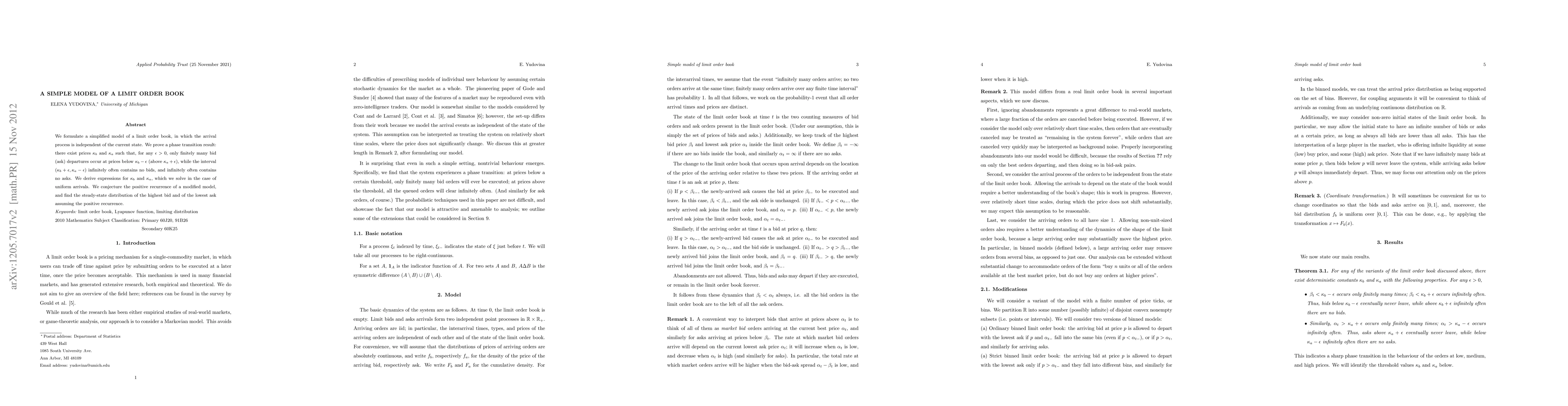 We formulate a simplified model of a limit order book, in which the arrival process is independent of the current state. We prove a phase transition result: there exist prices $\kappa_b$ and $\kappa_a$ such that, for any $\epsilon > 0$, only finitely many bid (ask) departures occur at prices below $\kappa_b-\epsilon$ (above $\kappa_a+\epsilon$), while the interval $(\kappa_b+\epsilon, \kappa_a - \epsilon)$ infinitely often contains no bids, and infinitely often contains no asks. We derive expressions for $\kappa_b$ and $\kappa_a$, which we solve in the case of uniform arrivals. We conjecture the positive recurrence of a modified model, and find the steady-state distribution of the highest bid and of the lowest ask assuming the positive recurrence.