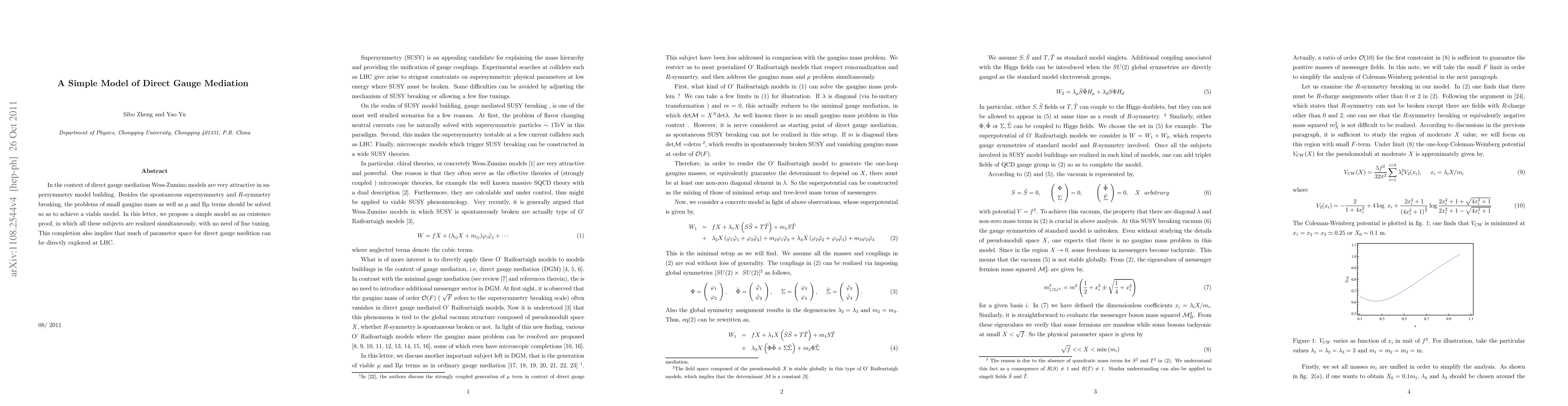 This paper proposes a simple model for direct gauge mediation in supersymmetry, demonstrating how to address issues like small gaugino masses and the {\mu} and B{\mu} terms without fine-tuning, suggesting that much of the relevant parameter space can be explored at the LHC.