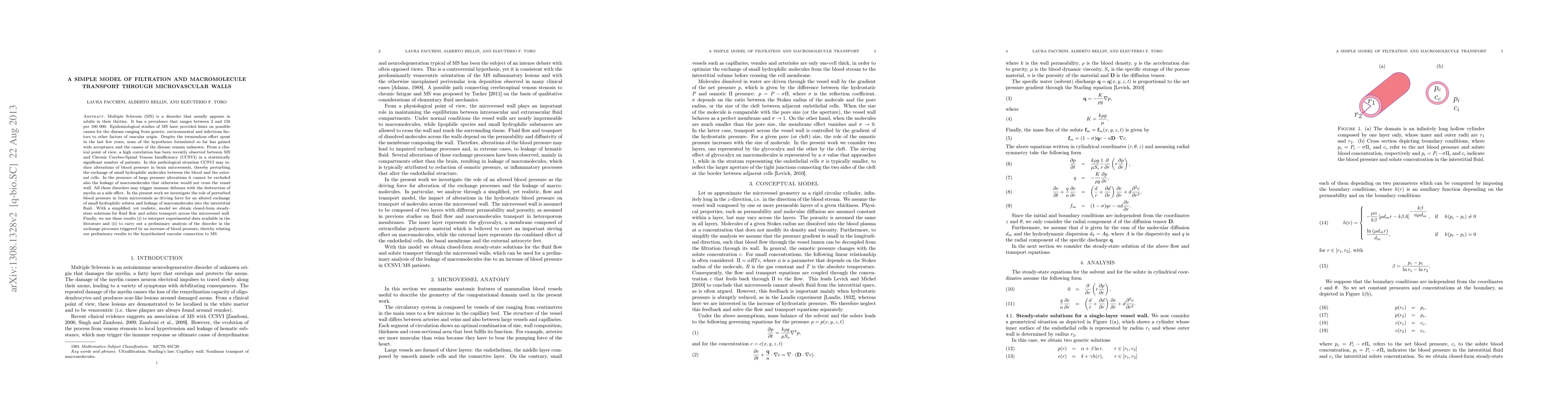 Multiple Sclerosis (MS) is a disorder that usually appears in adults in their thirties. It has a prevalence that ranges between 2 and 150 per 100 000. Epidemiological studies of MS have provided hints on possible causes for the disease ranging from genetic, environmental and infectious factors to other factors of vascular origin. Despite the tremendous effort spent in the last few years, none of the hypotheses formulated so far has gained wide acceptance and the causes of the disease remain unknown. From a clinical point of view, a high correlation has been recently observed between MS and Chronic Cerebro-Spinal Venous Insufficiency (CCSVI) in a statistically significant number of patients. In this pathological situation CCSVI may induce alterations of blood pressure in brain microvessels, thereby perturbing the exchange of small hydrophilic molecules between the blood and the external cells. In the presence of large pressure alterations it cannot be excluded also the leakage of macromolecules that otherwise would not cross the vessel wall. All these disorders may trigger immune defenses with the destruction of myelin as a side effect. In the present work we investigate the role of perturbed blood pressure in brain microvessels as driving force for an altered exchange of small hydrophilic solutes and leakage of macromolecules into the interstitial fluid. With a simplified, yet realistic, model we obtain closed-form steady-state solutions for fluid flow and solute transport across the microvessel wall. Finally, we use these results (i) to interpret experimental data available in the literature and (ii) to carry out a preliminary analysis of the disorder in the exchange processes triggered by an increase of blood pressure, thereby relating our preliminary results to the hypothesised vascular connection to MS.