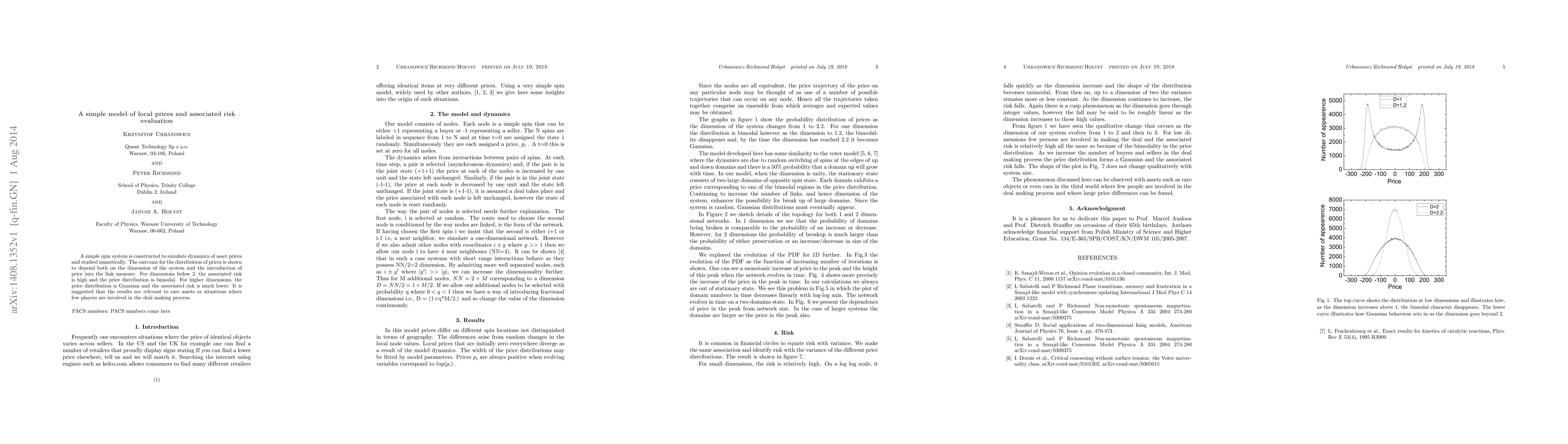 A simple spin system is constructed to simulate dynamics of asset prices and studied numerically. The outcome for the distribution of prices is shown to depend both on the dimension of the system and the introduction of price into the link measure. For dimensions below 2, the associated risk is high and the price distribution is bimodal. For higher dimensions, the price distribution is Gaussian and the associated risk is much lower. It is suggested that the results are relevant to rare assets or situations where few players are involved in the deal making process.