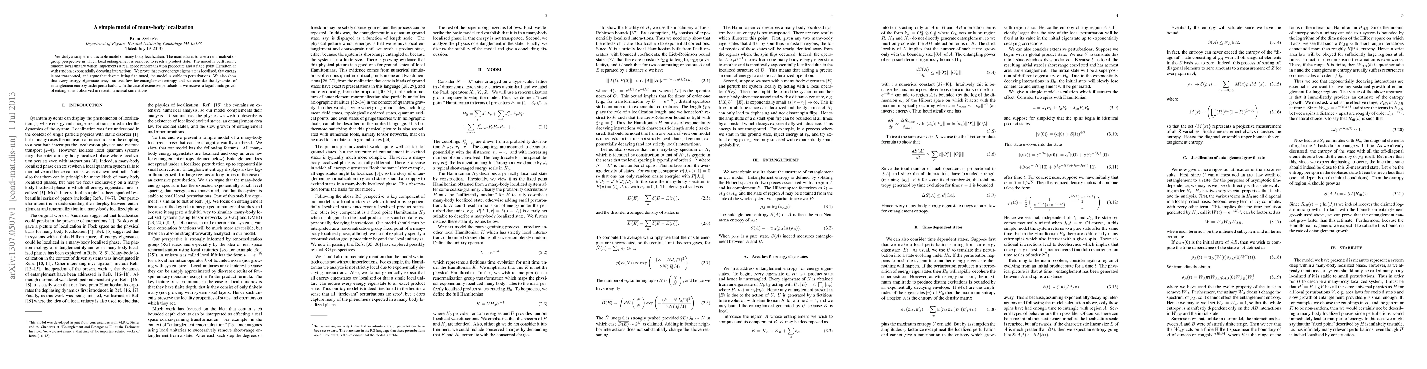 This research paper introduces a simple model of many-body localization, showing that every energy eigenstate is localized and obeys an area law for entanglement entropy, with stable dynamics even under extensive perturbations.