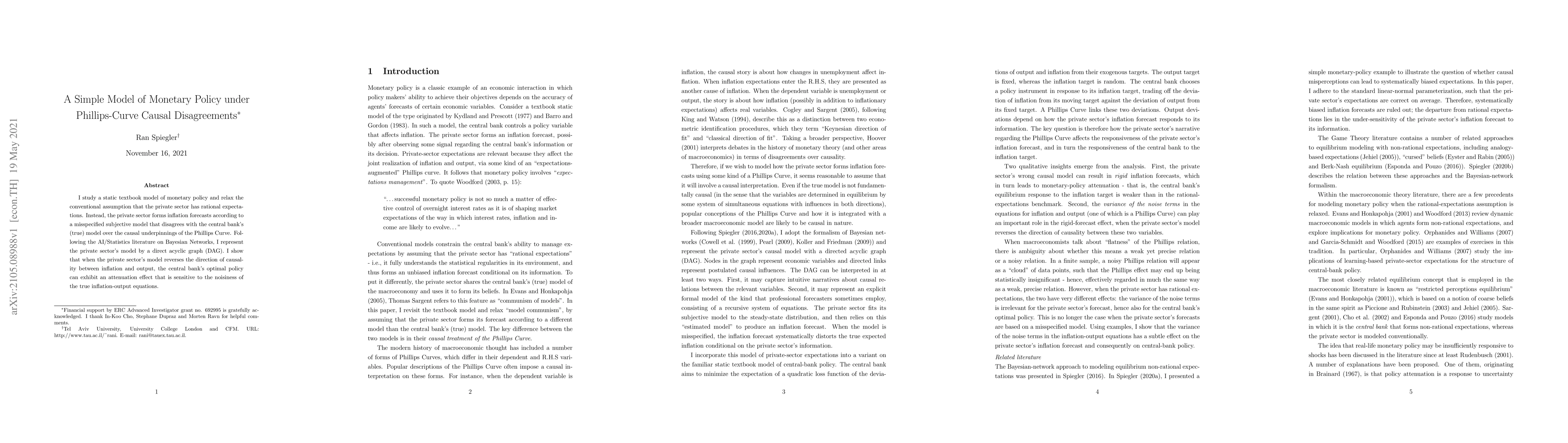 I study a static textbook model of monetary policy and relax the conventional assumption that the private sector has rational expectations. Instead, the private sector forms inflation forecasts according to a misspecified subjective model that disagrees with the central bank's (true) model over the causal underpinnings of the Phillips Curve. Following the AI/Statistics literature on Bayesian Networks, I represent the private sector's model by a direct acyclic graph (DAG). I show that when the private sector's model reverses the direction of causality between inflation and output, the central bank's optimal policy can exhibit an attenuation effect that is sensitive to the noisiness of the true inflation-output equations.