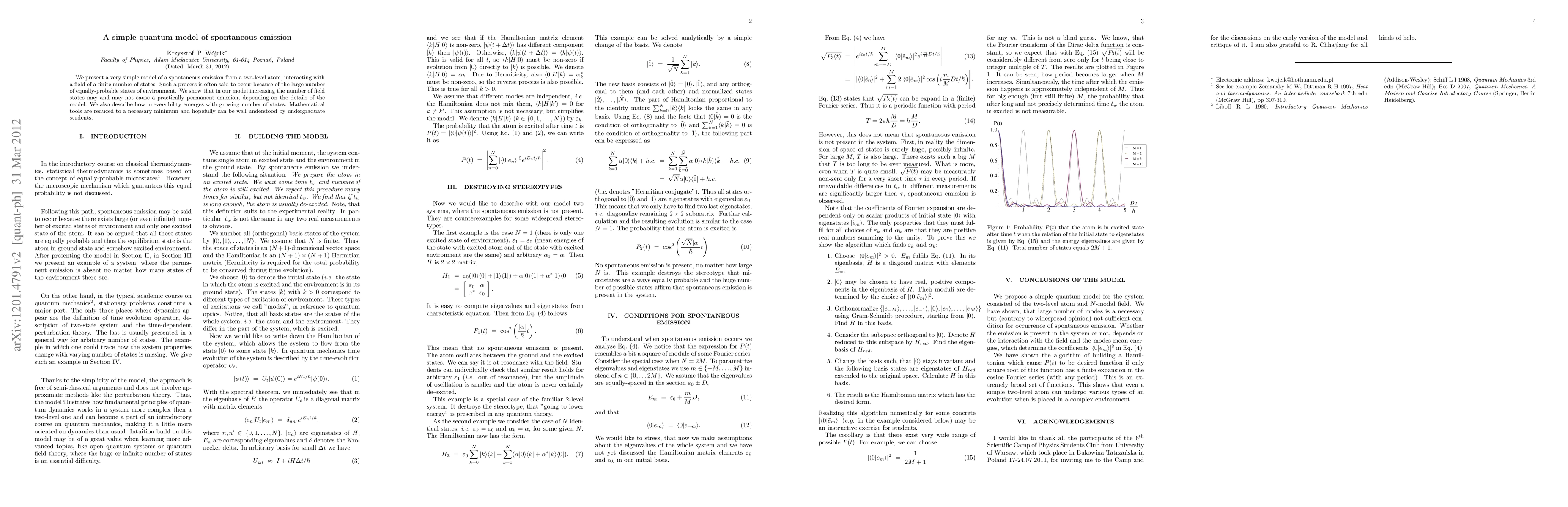 We present a very simple model of a spontaneous emission from a two-level atom, interacting with a field of a finite number of states. Such a process is often said to occur because of the large number of equally-probable states of environment. We show that in our model increasing the number of field states may and may not cause a practically permanent emission, depending on the details of the model. We also describe how irreversibility emerges with growing number of states. Mathematical tools are reduced to a necessary minimum and hopefully can be well understood by undergraduate students.