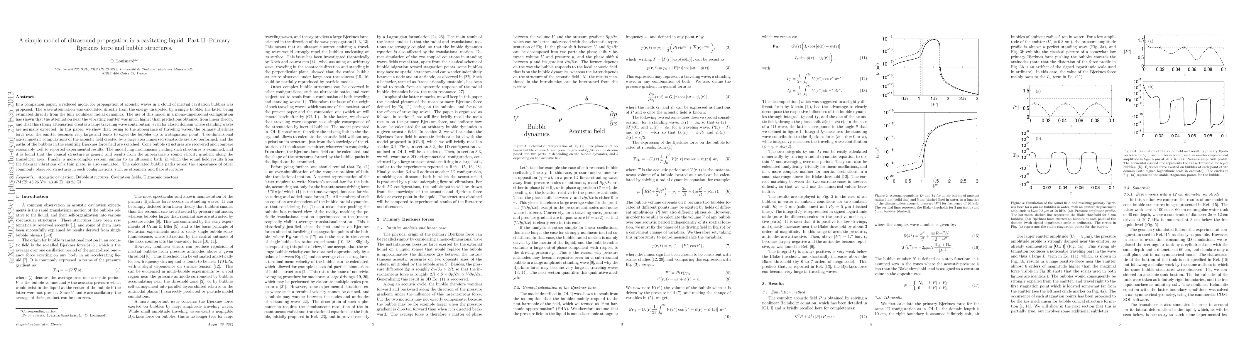 In a companion paper, a reduced model for propagation of acoustic waves in a cloud of inertial cavitation bubbles was proposed. The wave attenuation was calculated directly from the energy dissipated by a single bubble, the latter being estimated directly from the fully nonlinear radial dynamics. The use of this model in a mono-dimensional configuration has shown that the attenuation near the vibrating emitter was much higher than predictions obtained from linear theory, and that this strong attenuation creates a large traveling wave contribution, even for closed domain where standing waves are normally expected. In this paper, we show that, owing to the appearance of traveling waves, the primary Bjerknes force near the emitter becomes very large and tends to expel the bubbles up to a stagnation point. Two-dimensional axi-symmetric computations of the acoustic field created by a large area immersed sonotrode are also performed, and the paths of the bubbles in the resulting Bjerknes force field are sketched. Cone bubble structures are recovered and compare reasonably well to reported experimental results. The underlying mechanisms yielding such structures is examined, and it is found that the conical structure is generic and results from the appearance a sound velocity gradient along the transducer area. Finally, a more complex system, similar to an ultrasonic bath, in which the sound field results from the flexural vibrations of a thin plate, is also simulated. The calculated bubble paths reveal the appearance of other commonly observed structures in such configurations, such as streamers and flare structures.