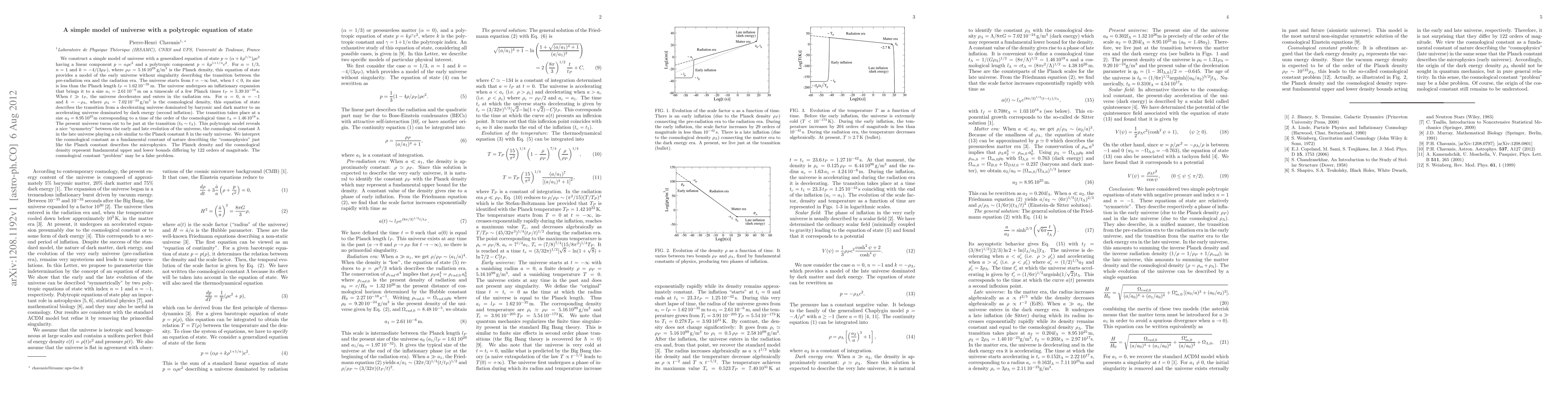 We construct a simple model of universe with a generalized equation of state $p=(\alpha +k\rho^{1/n})\rho c^2$ having a linear component $p=\alpha\rho c^2$ and a polytropic component $p=k\rho^{1+1/n}c^2$. For $\alpha=1/3$, $n=1$ and $k=-4/(3\rho_P)$, where $\rho_P=5.16 10^{99} g/m^3$ is the Planck density, this equation of state provides a model of the early universe without singularity describing the transition between the pre-radiation era and the radiation era. The universe starts from $t=-\infty$ but, when $t<0$, its size is less than the Planck length $l_P=1.62 10^{-35} m$. The universe undergoes an inflationary expansion that brings it to a size $a_1=2.61 10^{-6} m$ on a timescale of a few Planck times $t_P=5.39 10^{-44} s$. When $t\gg t_P$, the universe decelerates and enters in the radiation era. For $\alpha=0$, $n=-1$ and $k=-\rho_{\Lambda}$, where $\rho_{\Lambda}=7.02 10^{-24} g}/m^3$ is the cosmological density, this equation of state describes the transition from a decelerating universe dominated by baryonic and dark matter to an accelerating universe dominated by dark energy (second inflation). The transition takes place at a size $a_2=8.95 10^{25} m$ corresponding to a time of the order of the cosmological time $t_{\Lambda}=1.46 10^{18} s$. This polytropic model reveals a nice "symmetry" between the early and late evolution of the universe, the cosmological constant $\Lambda$ in the late universe playing a role similar to the Planck constant $\hbar$ in the early universe. We interpret the cosmological constant as a fundamental constant of nature describing the "cosmophysics" just like the Planck constant describes the microphysics. The Planck density and the cosmological density represent fundamental upper and lower bounds differing by ${122}$ orders of magnitude. The cosmological constant "problem" may be a false problem.