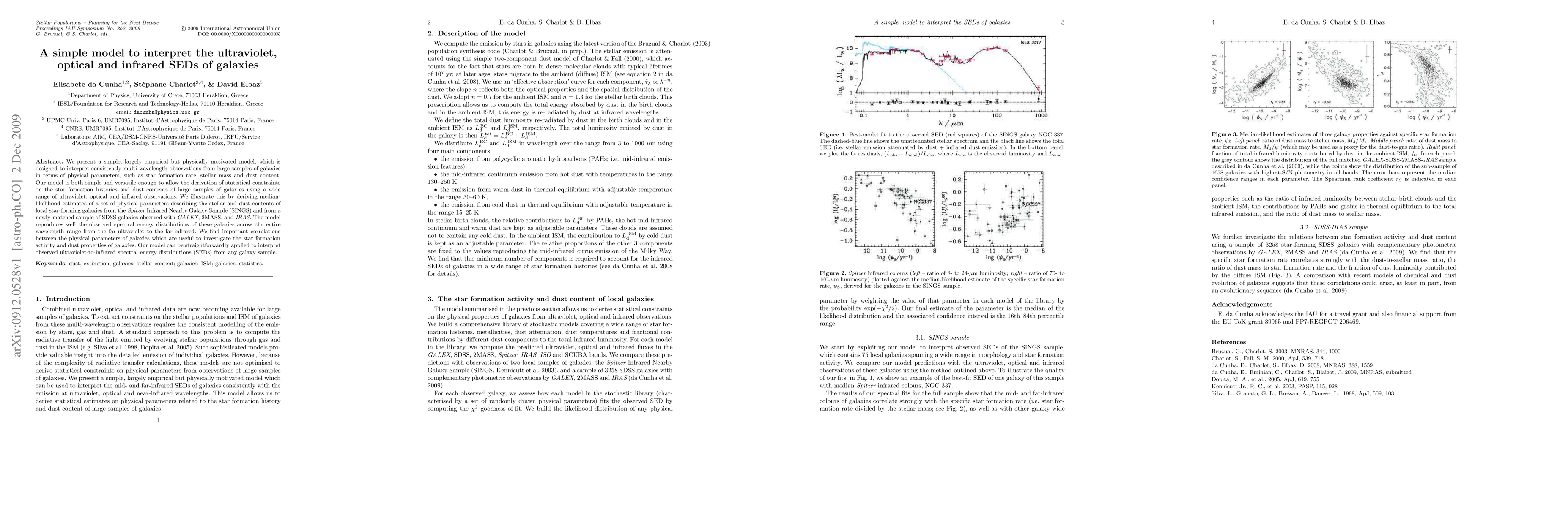 This paper introduces a simple, empirical yet physically motivated model to interpret the multi-wavelength spectral energy distributions (SEDs) of galaxies, allowing for the derivation of star formation rates, stellar mass, and dust content. The model effectively reproduces observed SEDs across ultraviolet to infrared wavelengths and reveals important correlations between galaxy physical parameters.