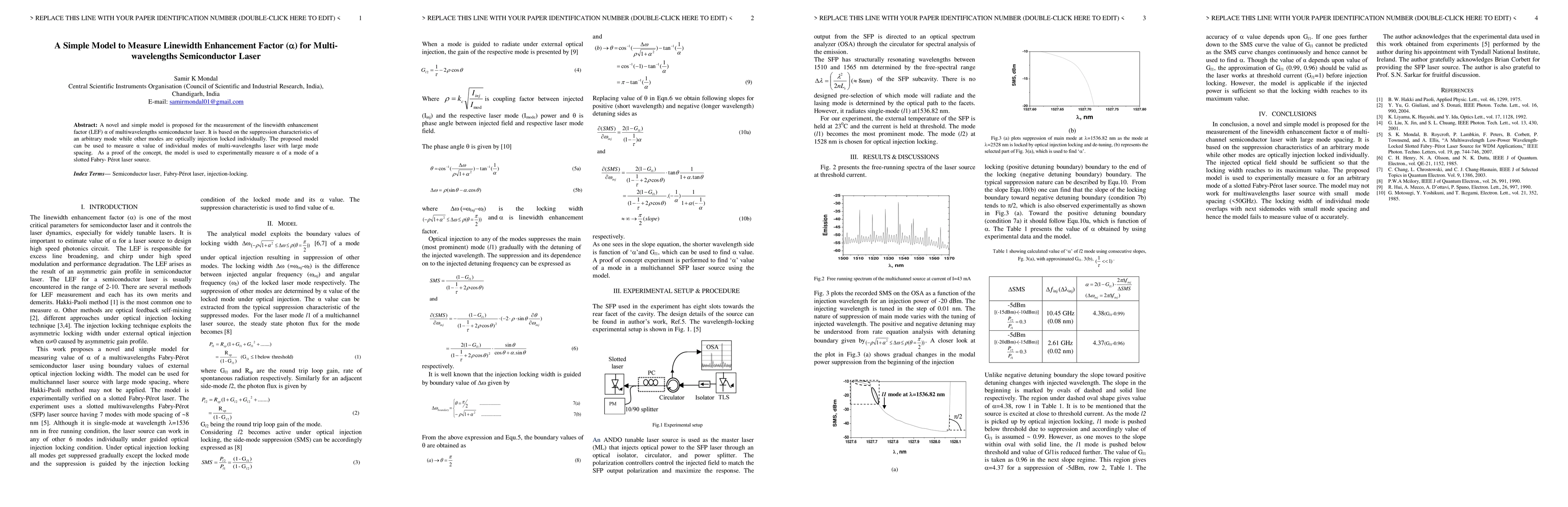 A new simple model is introduced to measure the Linewidth Enhancement Factor (α) in multiwavelength semiconductor lasers, utilizing the suppression of specific modes when others are injection-locked. The model successfully determines α for individual modes in a laser with large mode spacing, as demonstrated by an experiment on a slotted Fabry-Perot laser source.
