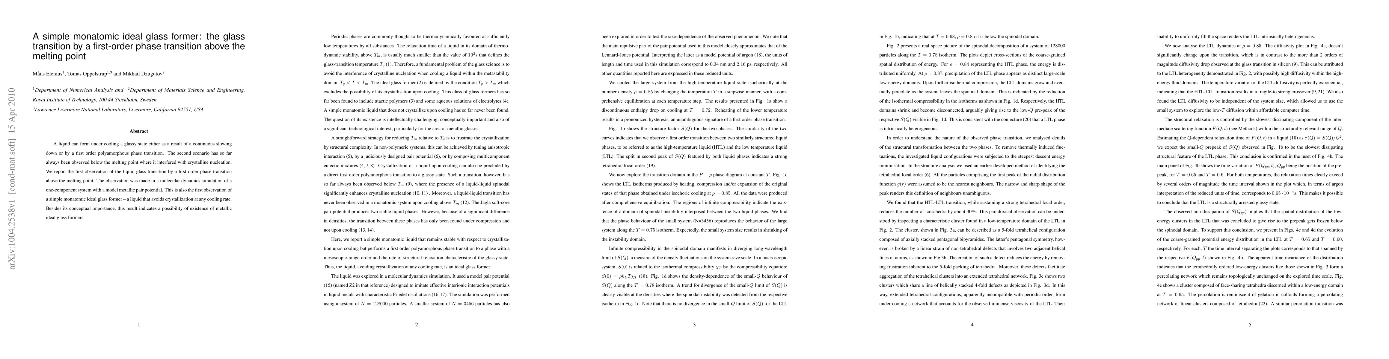 A liquid can form under cooling a glassy state either as a result of a continuous slowing down or by a first order polyamorphous phase transition. The second scenario has so far always been observed below the melting point where it interfered with crystalline nucleation. We report the first observation of the liquid-glass transition by a first order phase transition above the melting point. The observation was made in a molecular dynamics simulation of a one-component system with a model metallic pair potential. This is also the first observation of a simple monatomic ideal glass former -- a liquid that avoids crystallization at any cooling rate. Besides its conceptual importance, this result indicates a possibility of existence of metallic ideal glass formers.