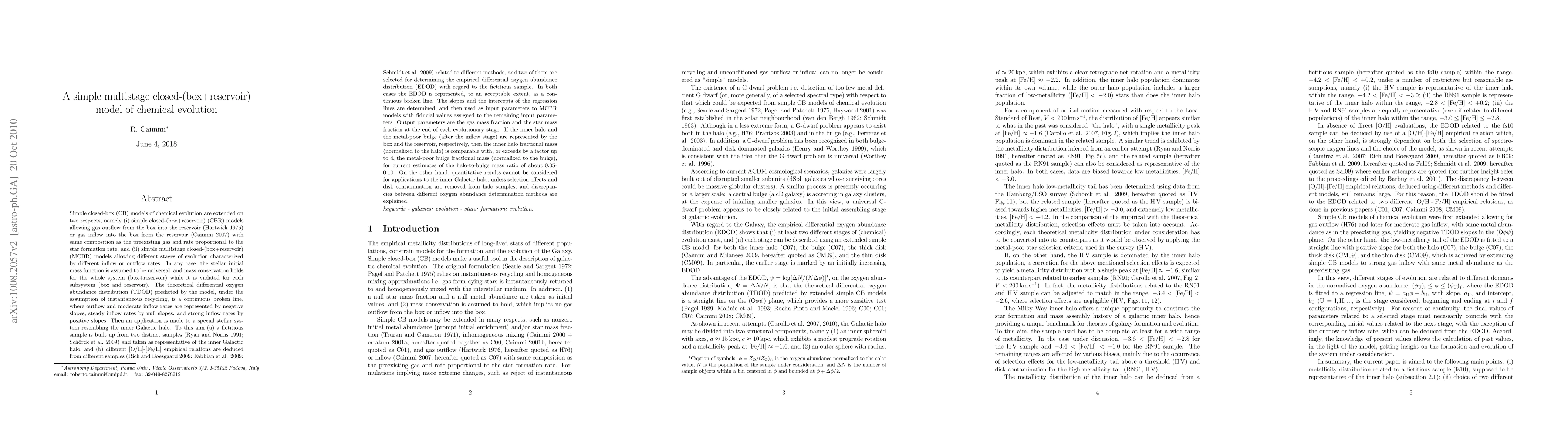 Simple closed-box (CB) models of chemical evolution are extended on two respects: (i) simple closed-(box+reservoir) (CBR) models allowing gas outflow from the box into the reservoir or gas inflow into the box from the reservoir with same composition as the preexisting gas and rate proportional to the star formation rate, and (ii) simple multistage closed-(box+reservoir) (MCBR) models allowing different stages of evolution characterized by different inflow or outflow rates. The stellar initial mass function is assumed to be universal, and mass conservation holds for the whole system (box+reservoir) while it is violated for each subsystem (box and reservoir). The theoretical differential oxygen abundance distribution (TDOD) predicted by the model, under the assumption of instantaneous recycling, is a continuous broken line, where different slopes are related to different inflow rates. For an application of the model (a) a fictitious sample is built up from two distinct samples and taken as representative of the inner Galactic halo, and (b) different [O/H]-[Fe/H] empirical relations are deduced from five different samples related to different methods, and two of them are selected for determining the empirical differential oxygen abundance distribution (EDOD) with regard to the fictitious sample. In both cases the EDOD is represented, to an acceptable extent, as a continuous broken line. If the inner halo and the metal-poor bulge (after the inflow stage) are represented by the box and the reservoir, respectively, then the inner halo fractional mass (normalized to the halo) is comparable with, or exceeds by a factor up to 4, the metal-poor bulge fractional mass (normalized to the bulge), for current estimates of the halo-to-bulge mass ratio of about 0.05-0.10.