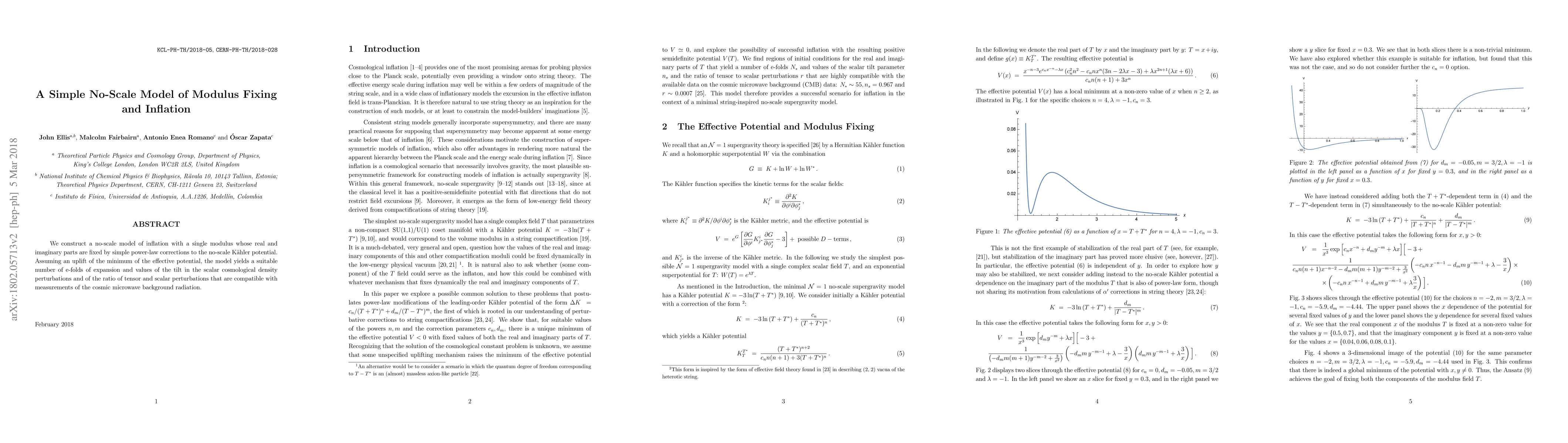 We construct a no-scale model of inflation with a single modulus whose real and imaginary parts are fixed by simple power-law corrections to the no-scale K{\" a}hler potential. Assuming an uplift of the minimum of the effective potential, the model yields a suitable number of e-folds of expansion and values of the tilt in the scalar cosmological density perturbations and of the ratio of tensor and scalar perturbations that are compatible with measurements of the cosmic microwave background radiation.