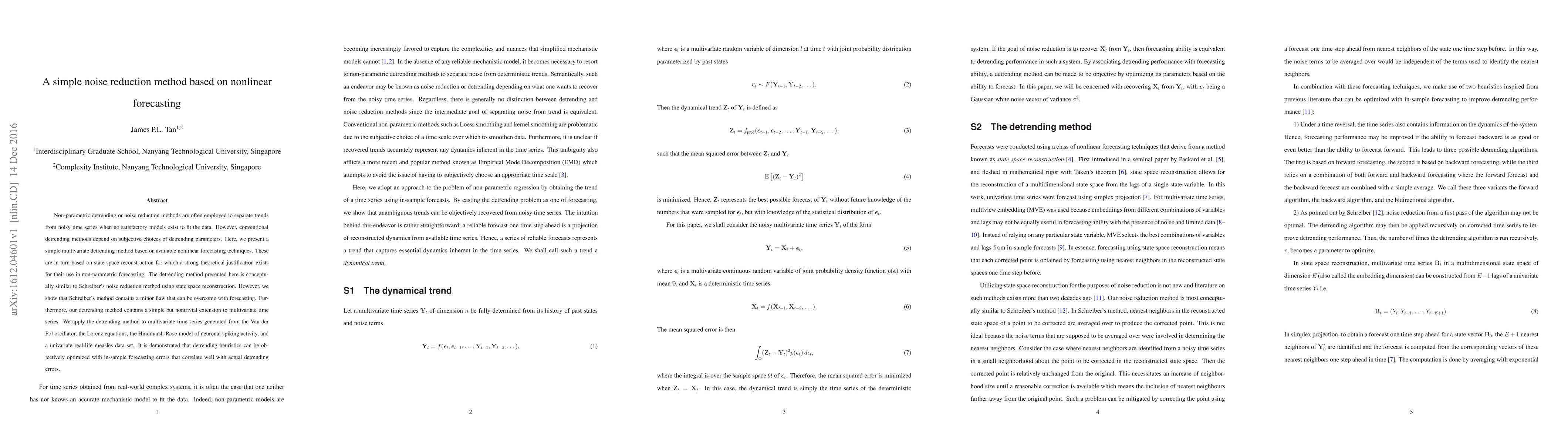 Researchers developed a simple noise reduction method using nonlinear forecasting techniques to separate trends from noisy time series without subjective detrending parameters. The method was applied to various datasets, including real-life measles data, with promising results in optimizing detrending heuristics based on in-sample forecasting errors.