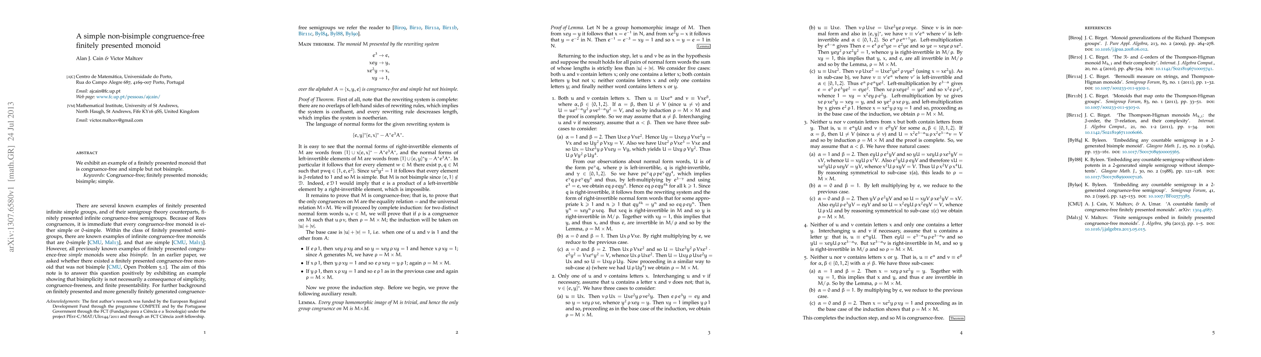This paper presents a finitely presented monoid that is simple and congruence-free but lacks bisimplicity, providing a unique example in the study of algebraic structures. The construction highlights a nuanced distinction within the properties of monoids.