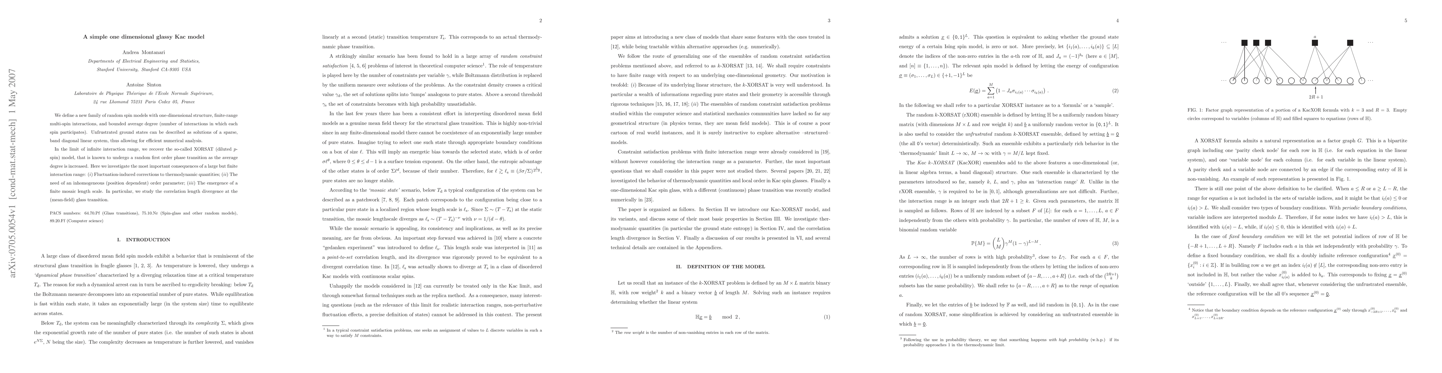 We define a new family of random spin models with one-dimensional structure, finite-range multi-spin interactions, and bounded average degree (number of interactions in which each spin participates). Unfrustrated ground states can be described as solutions of a sparse, band diagonal linear system, thus allowing for efficient numerical analysis. In the limit of infinite interaction range, we recover the so-called XORSAT (diluted p-spin) model, that is known to undergo a random first order phase transition as the average degree is increased. Here we investigate the most important consequences of a large but finite interaction range: (i) Fluctuation-induced corrections to thermodynamic quantities; (ii) The need of an inhomogeneous (position dependent) order parameter; (iii) The emergence of a finite mosaic length scale. In particular, we study the correlation length divergence at the (mean-field) glass transition.