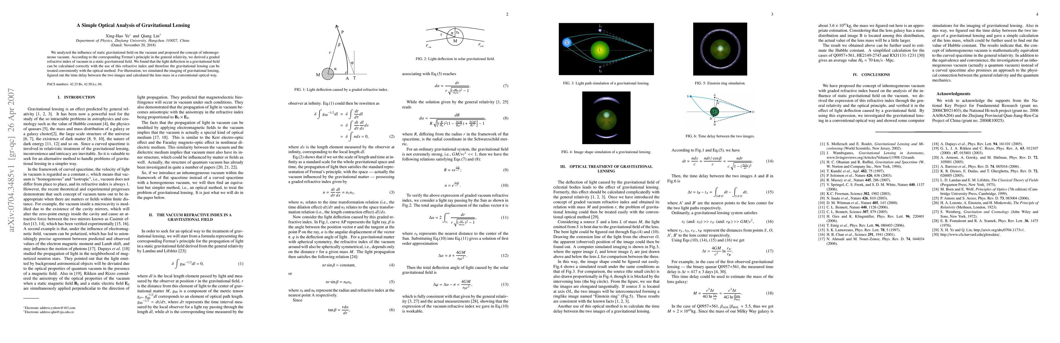 This paper proposes an optical analysis of gravitational lensing by using a graded refractive index for vacuum in a static gravitational field, derived from Fermat's principle in general relativity. The method allows for accurate calculation of light deflection and gravitational lensing effects, demonstrated through simulations showing time delays and lens mass estimation.
