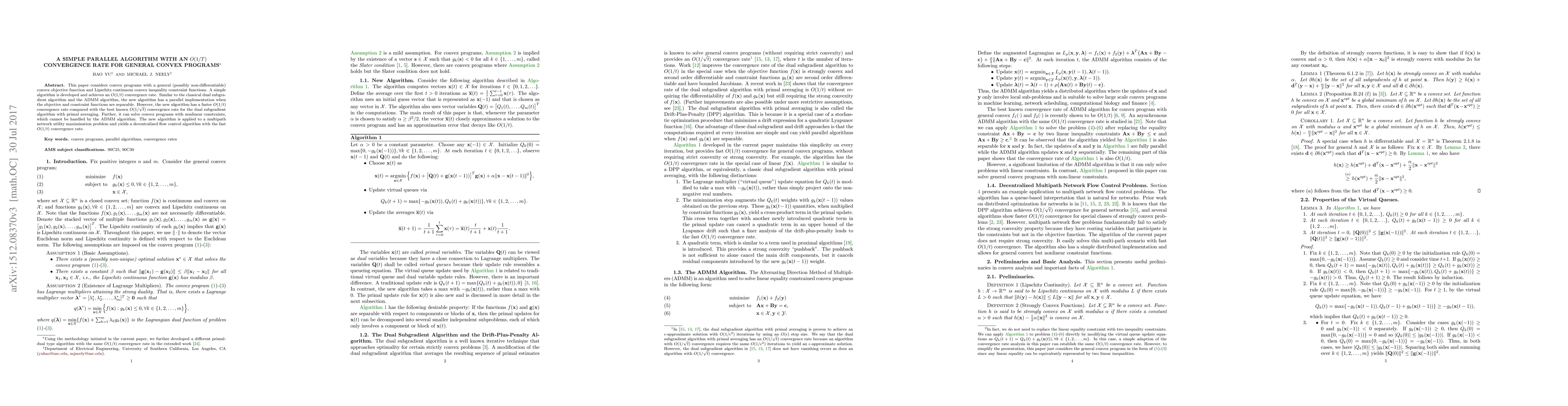 This paper considers convex programs with a general (possibly non-differentiable) convex objective function and Lipschitz continuous convex inequality constraint functions. A simple algorithm is developed and achieves an $O(1/t)$ convergence rate. Similar to the classical dual subgradient algorithm and the ADMM algorithm, the new algorithm has a parallel implementation when the objective and constraint functions are separable. However, the new algorithm has a faster $O(1/t)$ convergence rate compared with the best known $O(1/\sqrt{t})$ convergence rate for the dual subgradient algorithm with primal averaging. Further, it can solve convex programs with nonlinear constraints, which cannot be handled by the ADMM algorithm. The new algorithm is applied to a multipath network utility maximization problem and yields a decentralized flow control algorithm with the fast $O(1/t)$ convergence rate.