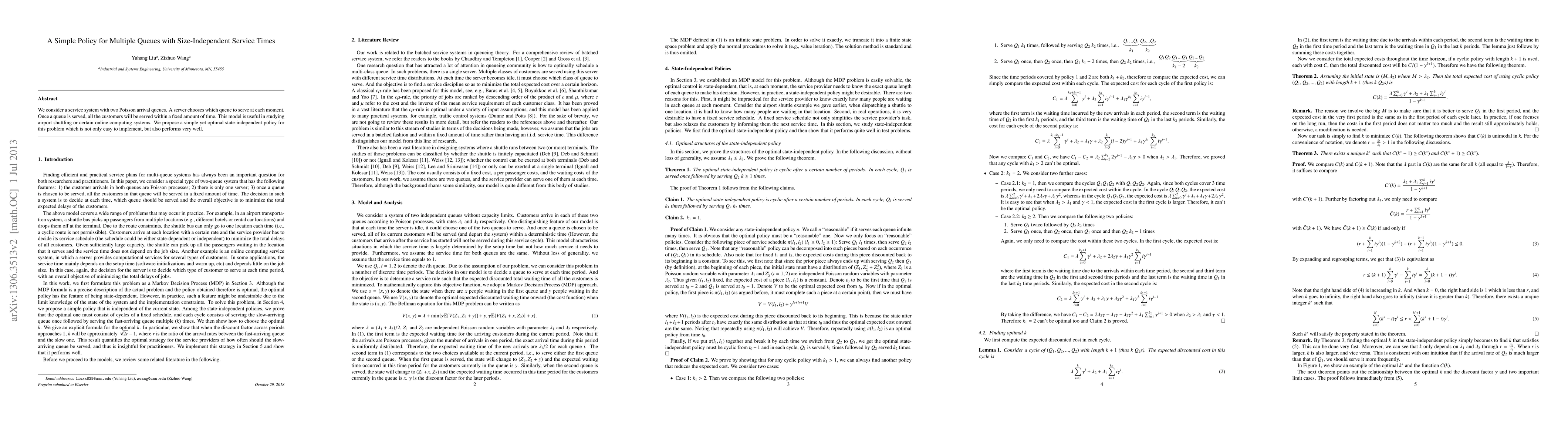 We consider a service system with two Poisson arrival queues. A server chooses which queue to serve at each moment. Once a queue is served, all the customers will be served within a fixed amount of time. This model is useful in studying airport shuttling or certain online computing systems. We propose a simple yet optimal state-independent policy for this problem which is not only easy to implement, but also performs very well.