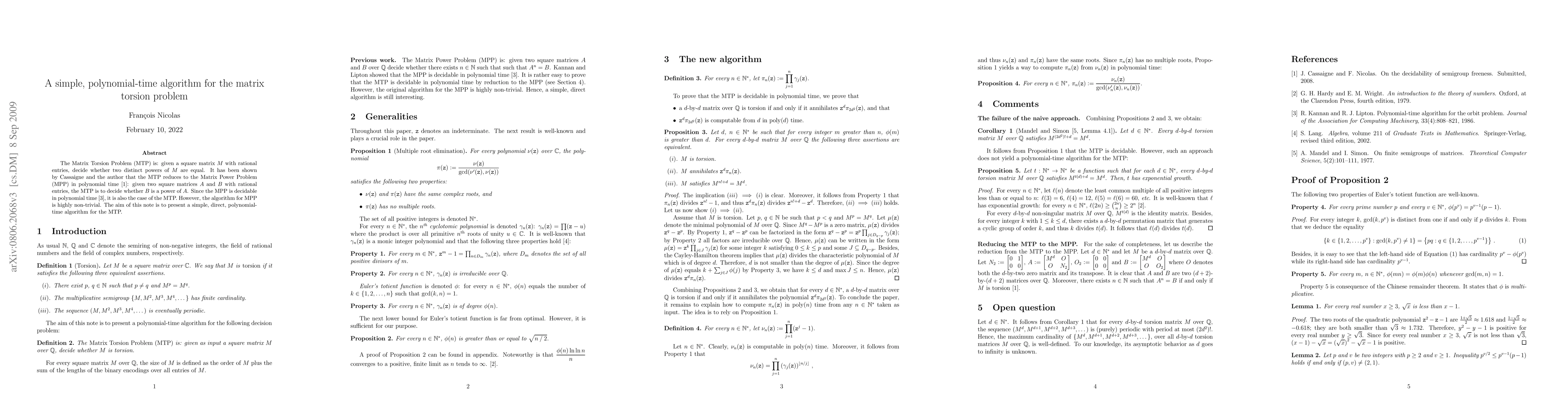 The Matrix Torsion Problem (MTP) is: given a square matrix M with rational entries, decide whether two distinct powers of M are equal. It has been shown by Cassaigne and the author that the MTP reduces to the Matrix Power Problem (MPP) in polynomial time: given two square matrices A and B with rational entries, the MTP is to decide whether B is a power of A. Since the MPP is decidable in polynomial time, it is also the case of the MTP. However, the algorithm for MPP is highly non-trivial. The aim of this note is to present a simple, direct, polynomial-time algorithm for the MTP.