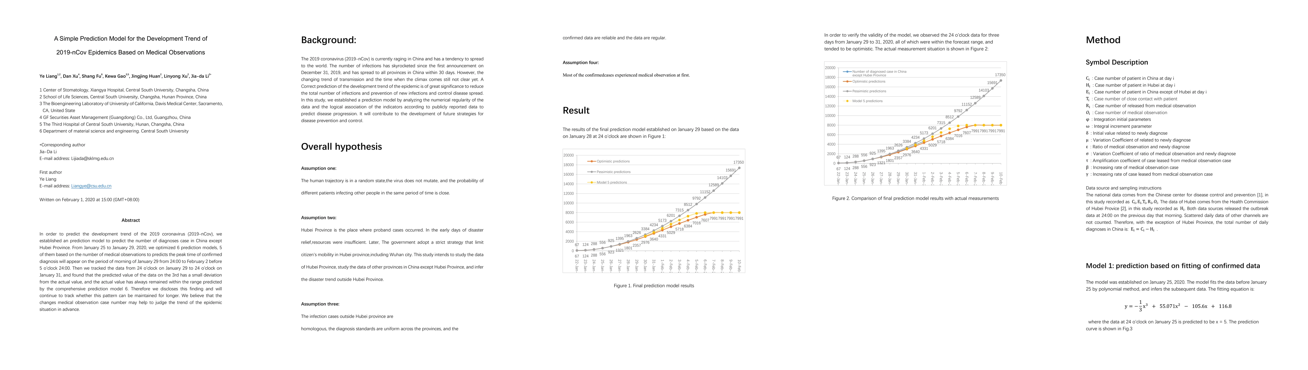 In order to predict the development trend of the 2019 coronavirus (2019-nCov), we established an prediction model to predict the number of diagnoses case in China except Hubei Province. From January 25 to January 29, 2020, we optimized 6 prediction models, 5 of them based on the number of medical observations to predicts the peak time of confirmed diagnosis will appear on the period of morning of January 29 from 24:00 to February 2 before 5 o'clock 24:00. Then we tracked the data from 24 o'clock on January 29 to 24 o'clock on January 31, and found that the predicted value of the data on the 3rd has a small deviation from the actual value, and the actual value has always remained within the range predicted by the comprehensive prediction model 6. Therefore we discloses this finding and will continue to track whether this pattern can be maintained for longer. We believe that the changes medical observation case number may help to judge the trend of the epidemic situation in advance.