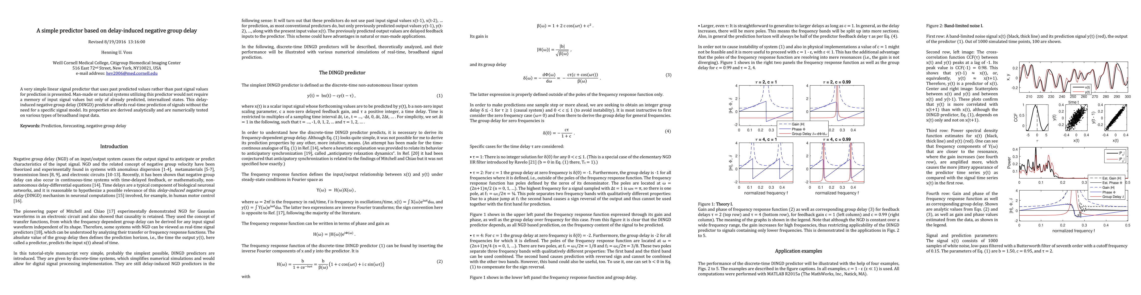 A very simple linear signal predictor that uses past predicted values rather than past signal values for prediction is presented. Man-made or natural systems utilizing this predictor would not require a memory of input signal values but only of already predicted, internalized states. This delay-induced negative group delay (DINGD) predictor affords real-time prediction of signals without the need for a specific signal model. Its properties are derived analytically and are numerically tested on various types of broadband input data.