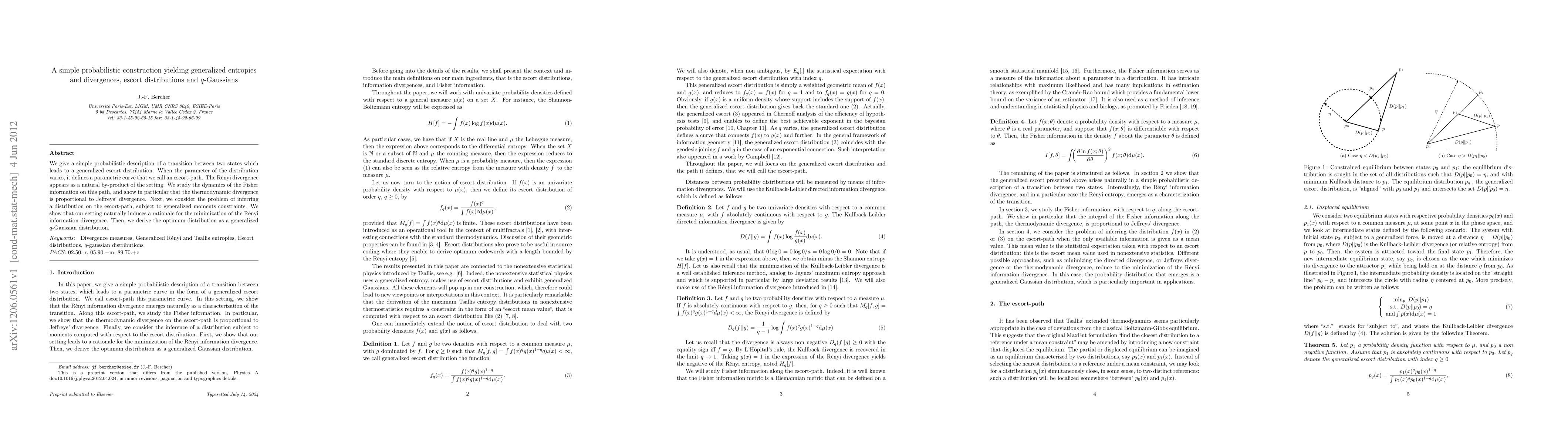 This paper presents a simple probabilistic framework that generates generalized entropies and divergences, including escort distributions and q-Gaussians. It explores the dynamics of Fisher information along an escort-path and shows that the thermodynamic divergence is proportional to Jeffreys' divergence, ultimately deriving a generalized q-Gaussian distribution as the optimum under generalized moments constraints.