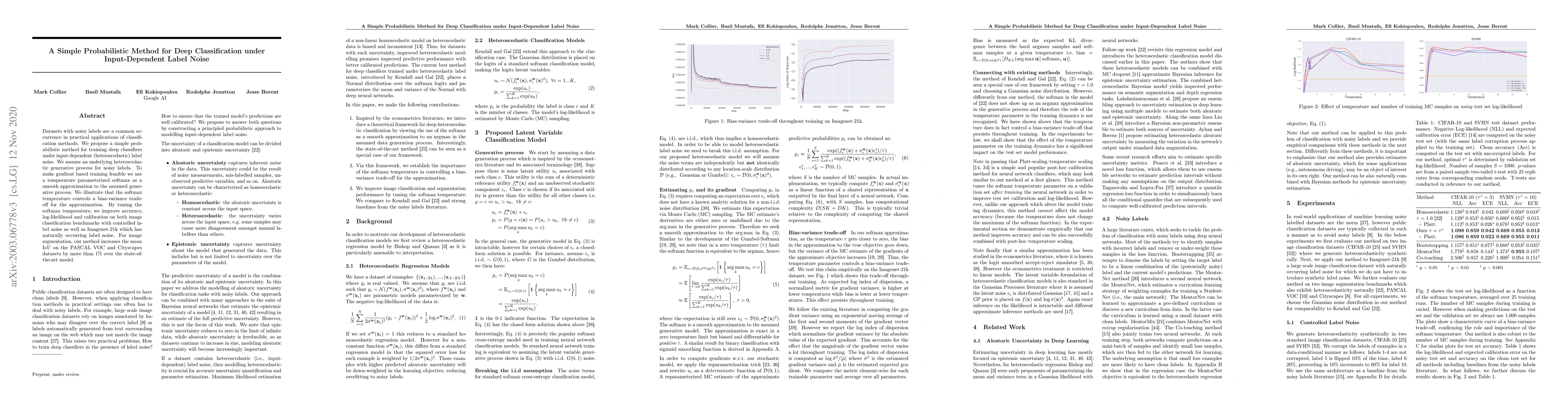 This paper proposes a simple probabilistic method to train deep classifiers under input-dependent label noise by using a temperature-parameterized softmax. The method improves accuracy, log-likelihood, and calibration on datasets with both controlled and naturally occurring label noise.