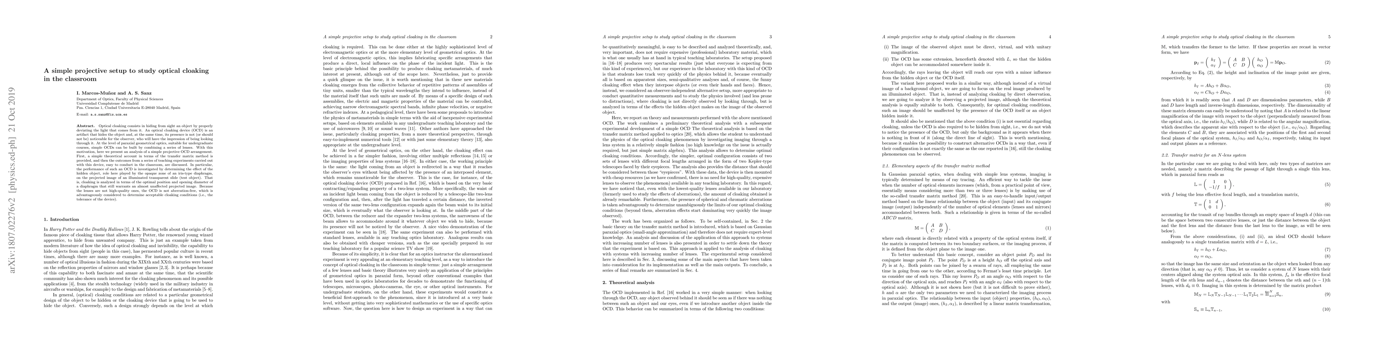 Researchers created a simple optical cloaking device using lenses that can hide objects without being noticeable to observers in a classroom setting.
