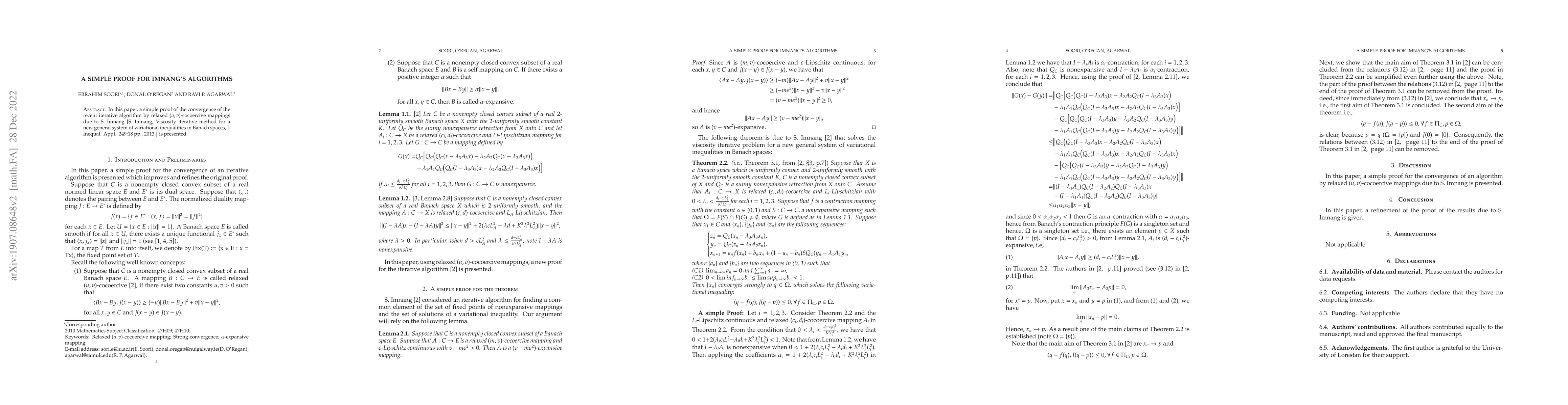 The paper introduces a simplified proof for the convergence of Imnang's iterative algorithm using relaxed cocoercive mappings, ensuring nonexpansiveness under specific conditions.