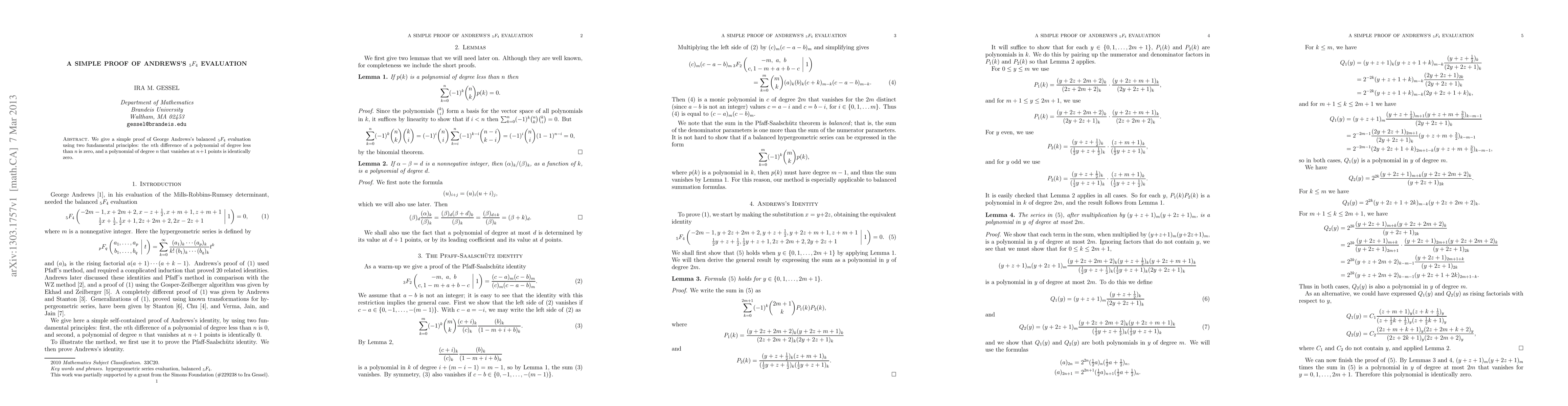 We give a simple proof of George Andrews's balanced 5F4 evaluation using two fundamental principles: the nth difference of a polynomial of degree less than n is zero, and a polynomial of degree n that vanishes at n+1 points is identically zero.